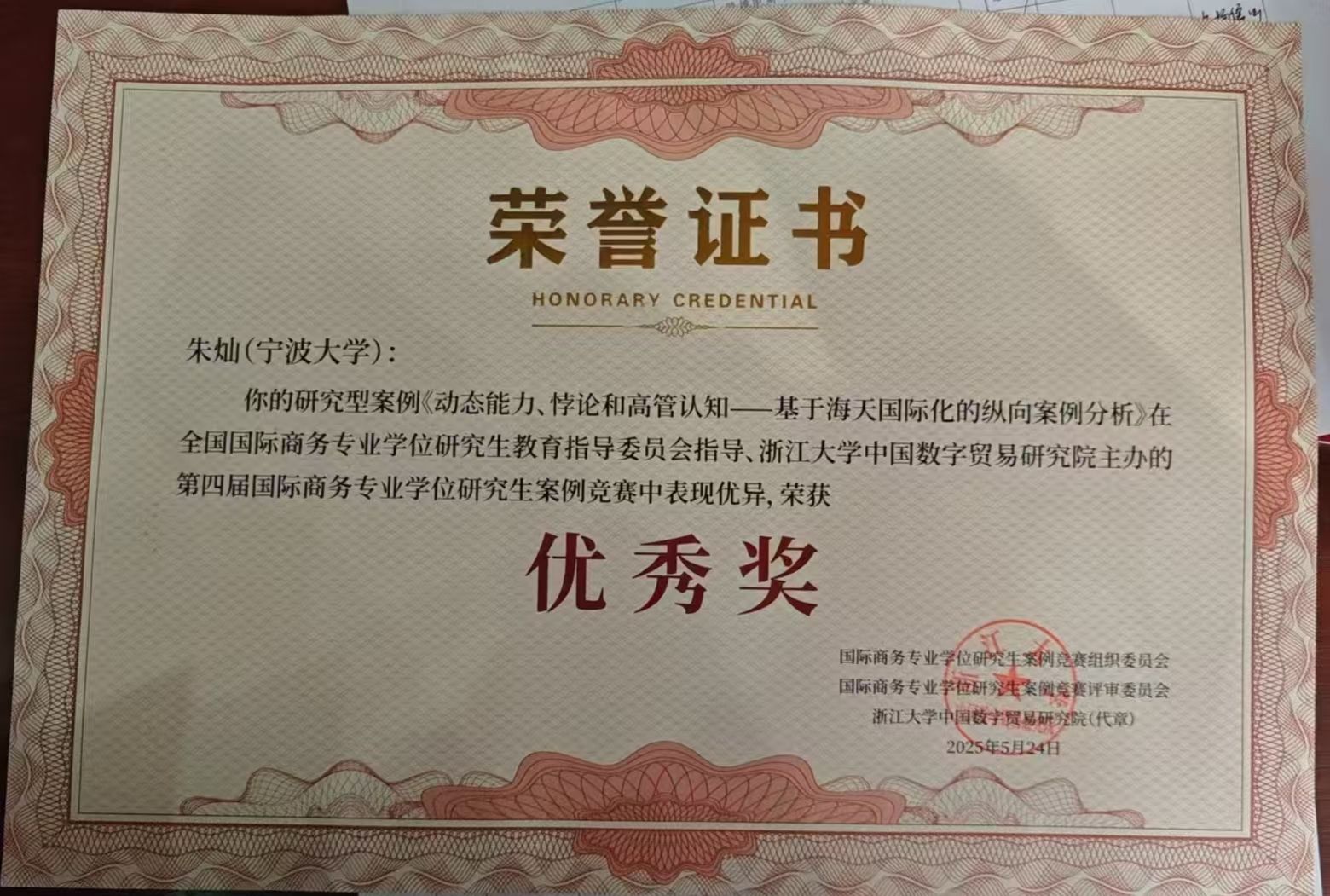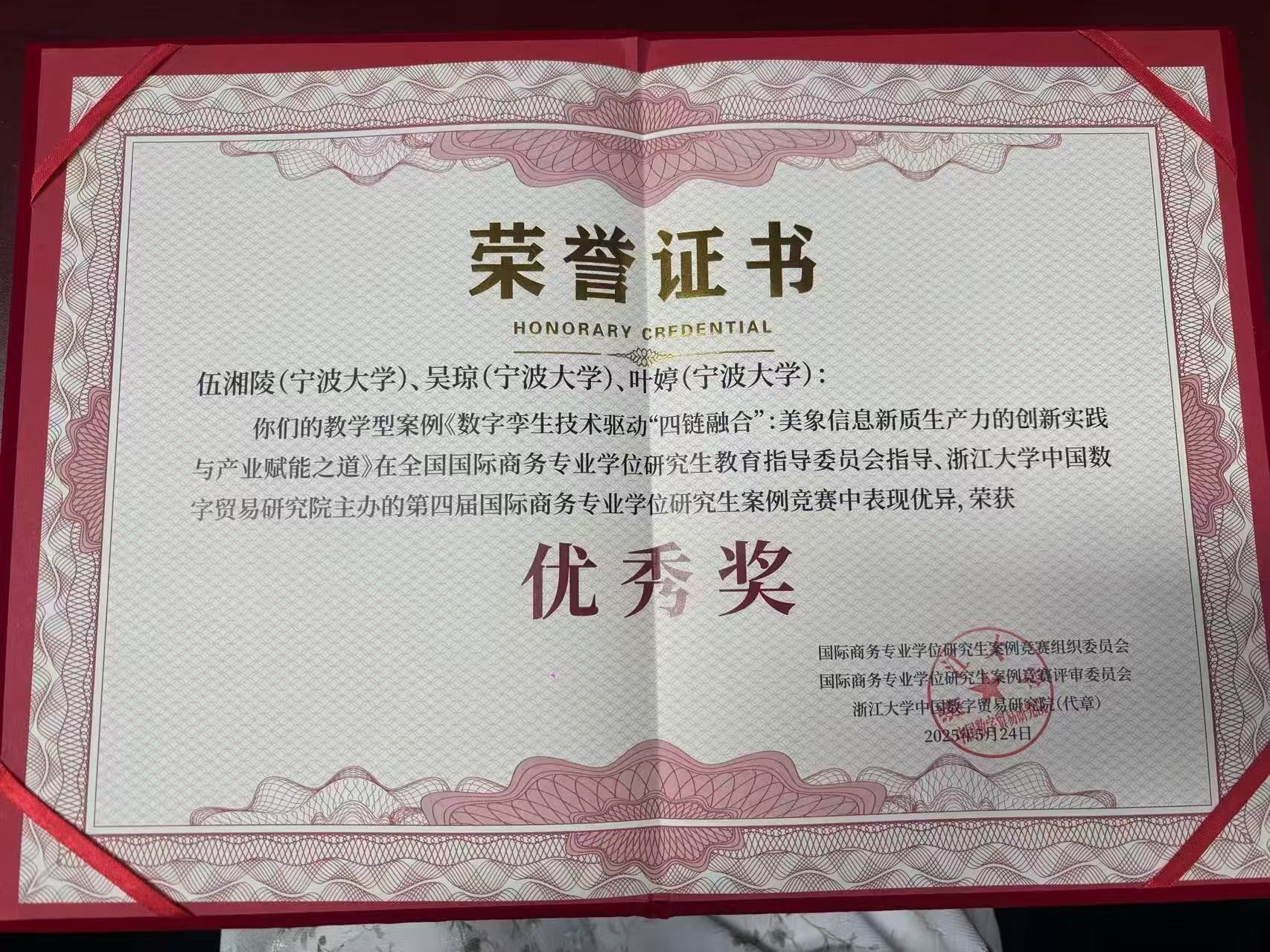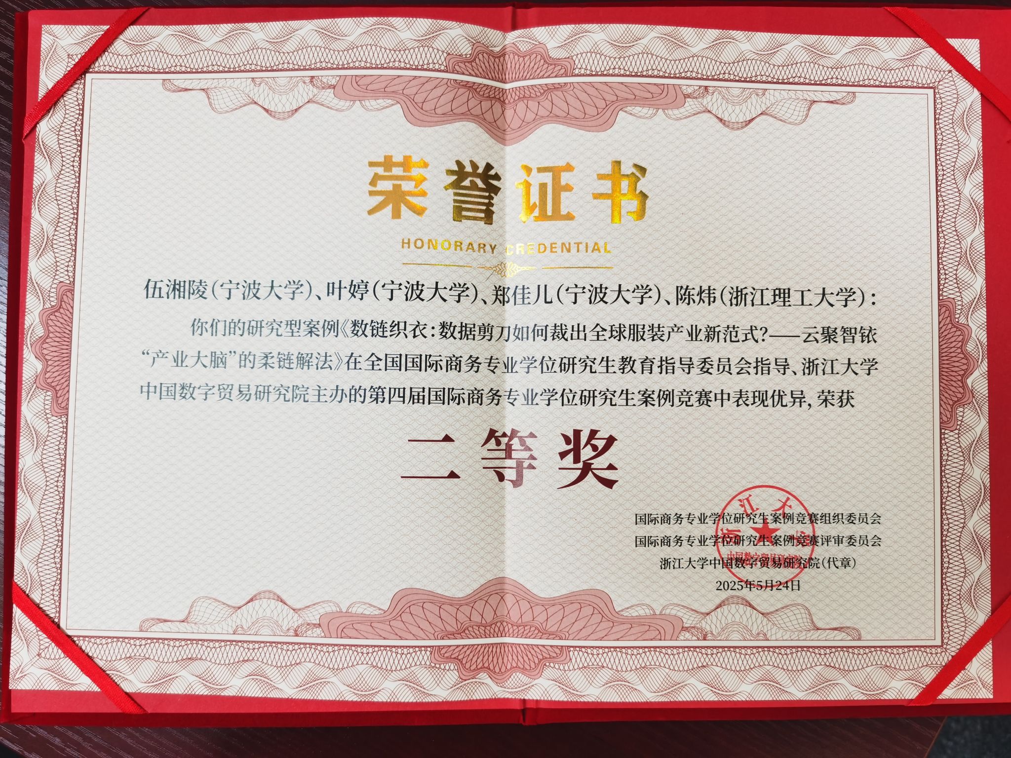MIB专职导师伍湘陵与2024级MIB研究生叶婷、郑佳儿撰写的案例《数链织衣:数据剪刀如何裁出全球服装产业新范式?——云聚智铱“产业大脑”的柔链解法》获评研究型案例二等奖,伍湘陵老师与2024级MIB研究生吴琼、叶婷撰写的案例《数字孪生技术驱动“四链融合”:美象信息新质生产力的创新实践与产业赋能之道》获评教学型案例优秀奖,2023级MIB研究生朱灿撰写的案例《动态能力、悖论和高管认知——基于海天国际化的纵向案例分析》获评研究型案例优秀奖。