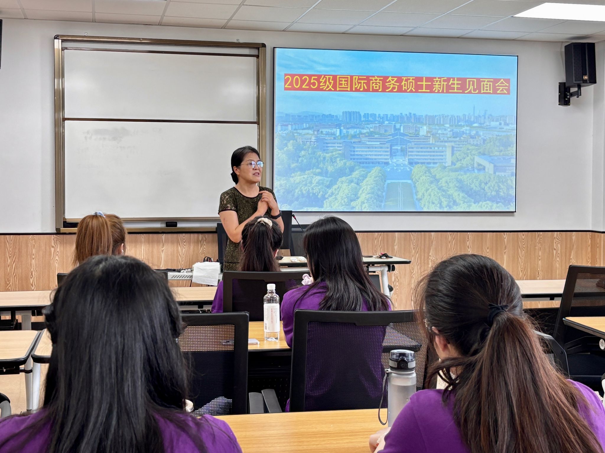 314教室顺利举行。本次见面会旨在帮助2025级新生明确学习目标、规划研究生生涯,为未来两年半的学习与研究奠定基础。学位点负责人杨丽华教授、MIB教育中心执行主任叶劲松老师与全体国际商务硕士新生面对面,帮助新生从入学第一天起“看见2028”,科学规划研究生阶段的学习、科研与职业发展。