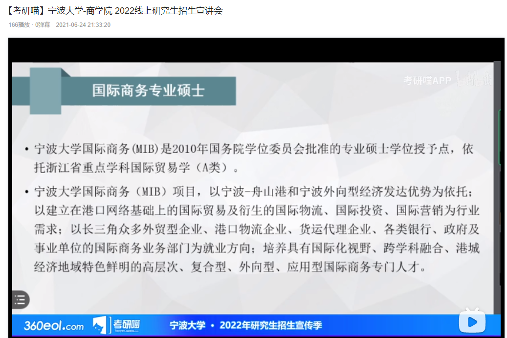 2021年6月23日,百家乐策略 2022线上研究生招生宣讲会在bilibili线上平台举行。国际商务专业硕士学位点负责人杨丽华讲授参加了线上宣讲会,介绍了百家乐策略 MIB项目的培养目标、特色及专业建设情况。