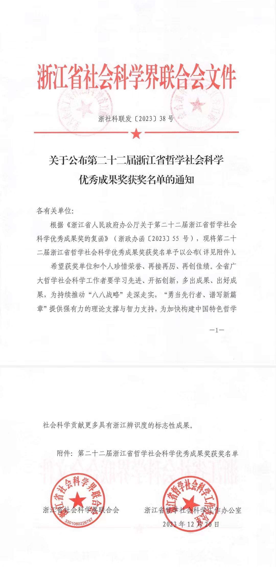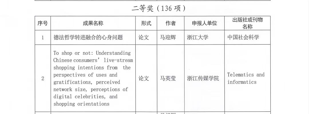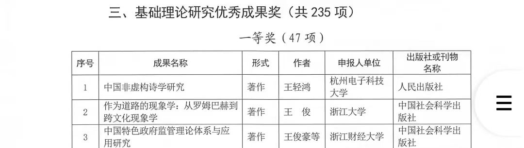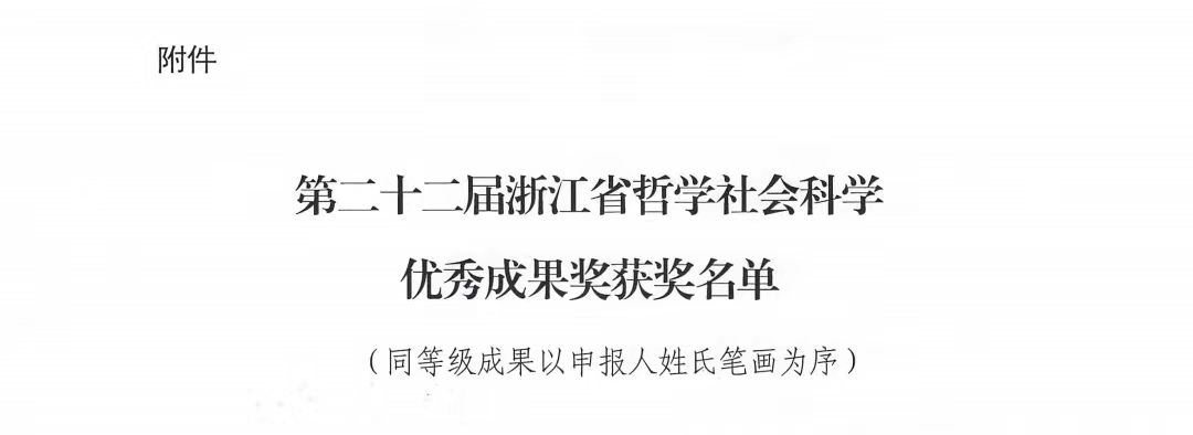 近日,根据《浙江省人民政府办公厅关于第二十二届浙江省哲学社会科学优秀成果奖的复函》(浙政办函〔2023〕55号),浙江省哲学社会科学工作办公室公布第二十二届浙江省哲学社会科学优秀成果奖获奖名单。