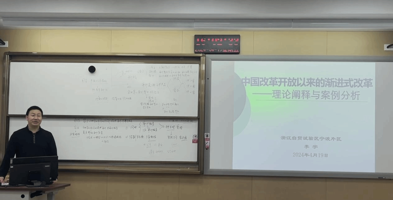 MIB《国际商务》课堂有幸邀请了宁波经济技术开发区管委会自贸区政策法规局副局长李宇为MIB学生讲解中国改革开放以来的渐进式改革,从中国改革开放的角度阐述了中国在过去的发展历程中是如何不断提升自身能力,加快步伐融入世界贸易大家庭。中国发展的奇迹不仅使得中国社会得到富强、人民生活得到提升,更重要是的中国在短短的几十年间实现了西方国家数百年才能达到的社会发展过程,这压缩的几十年对于世界来说是一个中国式奇迹。李老师先后介绍了对历史进程、改革逻辑、相关现实案例以及中国改革开放路径。