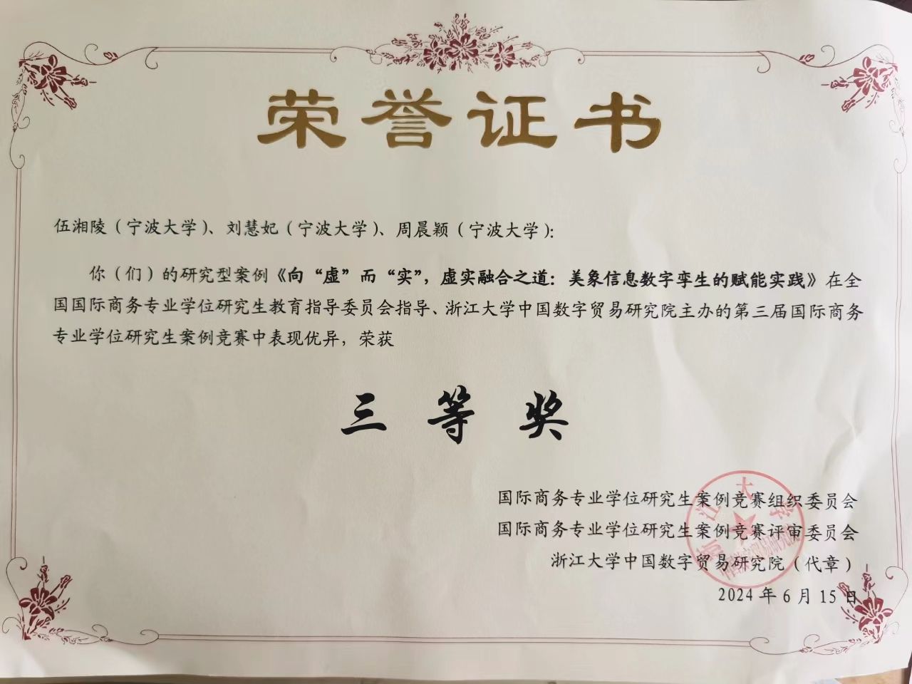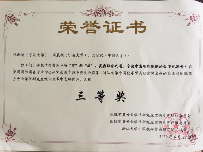 MIB专职导师伍湘陵与研究生周晨颖(2023MIB)、刘慧妃(2023应用经济学)撰写的案例《向“实”而“虚”,实虚融合之道:宁波中集智能制造的数字化跃升》获评教学型案例三等奖,《向“虚”而“实”,虚实融合之道:美象信息数字孪生的赋能实践》获评研究型案例三等奖。