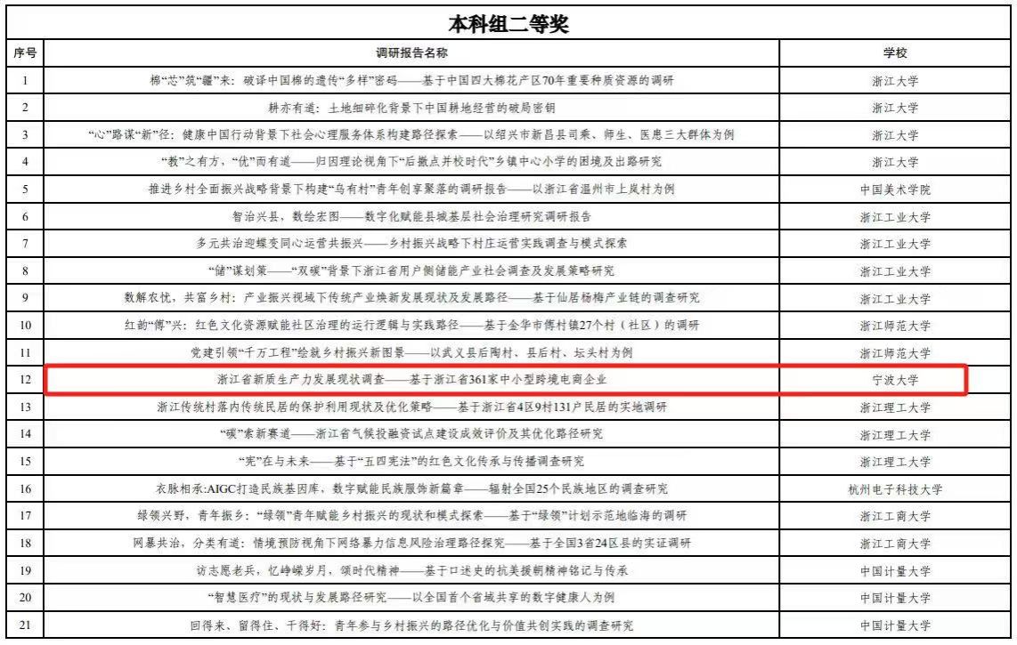 MIB研究生为主组建团队的“浙江省新质生产力发展现状调查--基于浙江省361家中小型跨境电商企业”实践调研项目荣获二等奖。