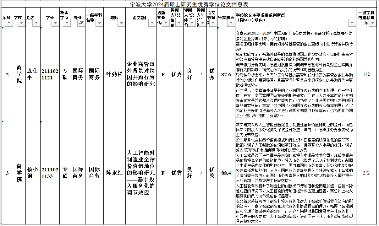 3月24日,百家乐策略 研究生院公示“百家乐策略 2024届研究生优秀学位论文”评选结果名单,百家乐策略 2021级MIB学生庞仕平、杨小刚两位同学的学位论文获评校级优秀论文。