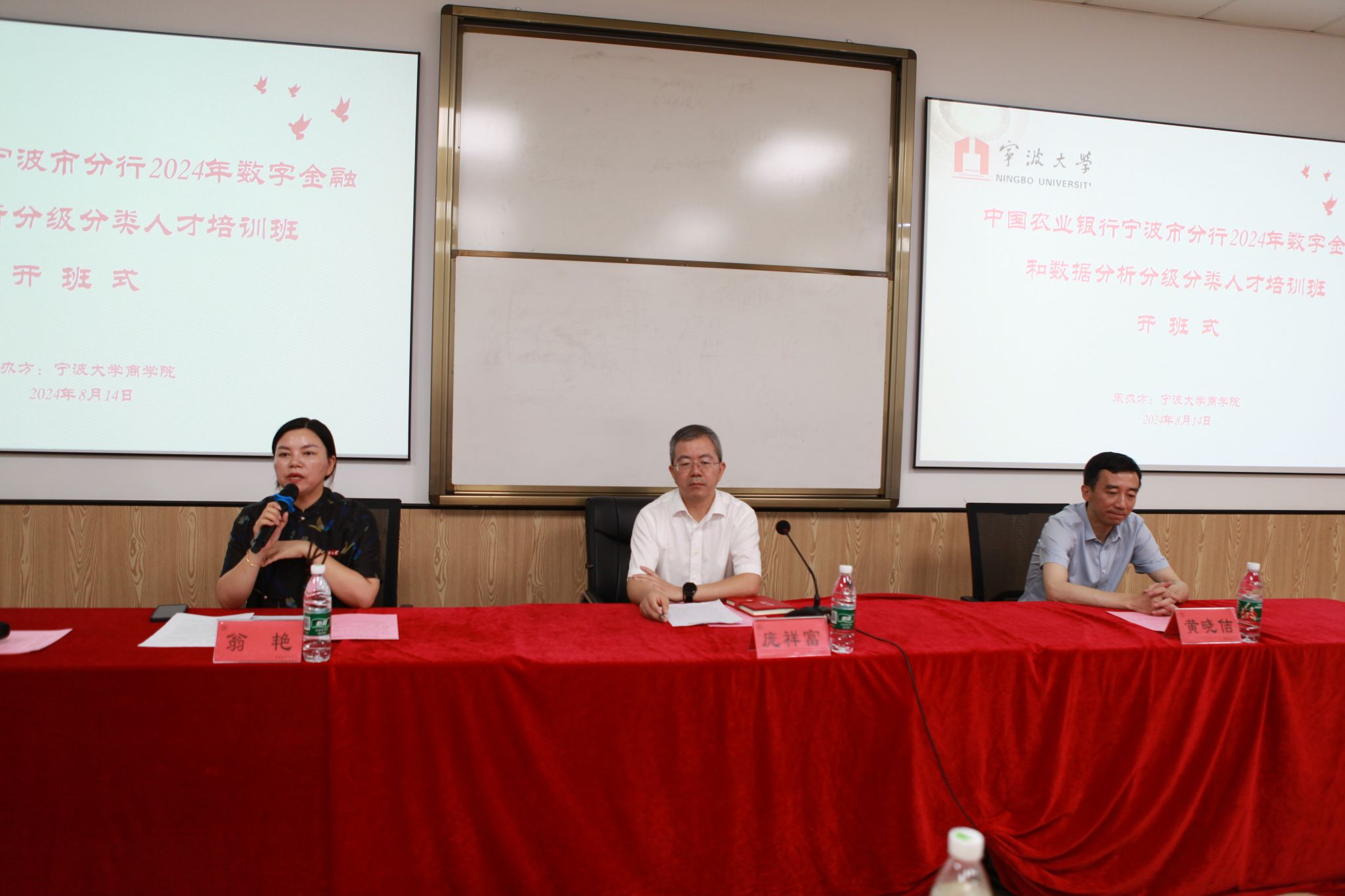 高级培训中心主任翁艳、中国农业银行宁波市分行科技与产品管理部总经理庞祥富、中国农业银行宁波市分行网络金融部总经理黄晓佶 出席开班仪式。