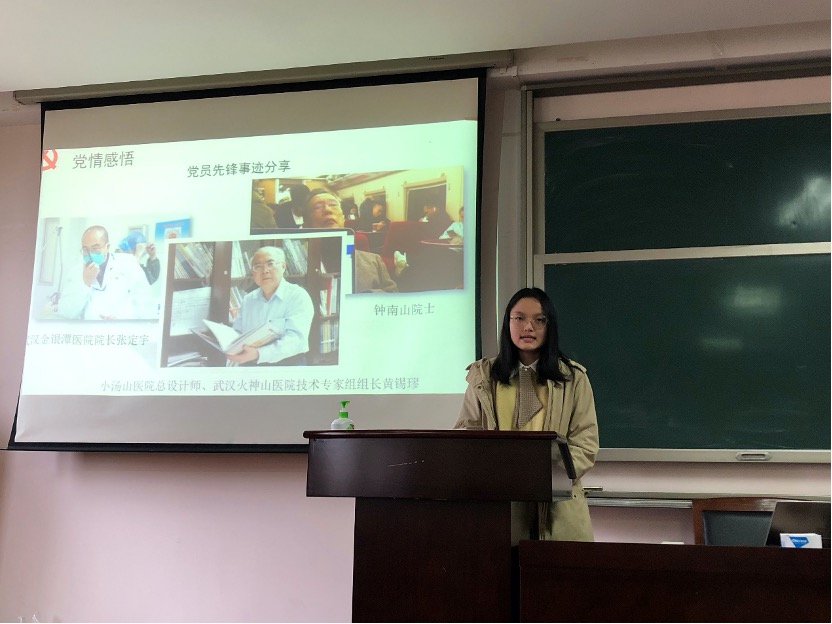 最后进入党情体悟环节。第七党支部的金越、金鸿飞和第八党支部的金昱琳,分别分享了武汉金银潭医院院长张定宇、武汉火神山医院技术专家组组长黄锡璆和钟南山院士的抗疫事迹。