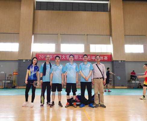 混双一组,由闭明雄老师和章舒怡老师配合,面对对手凌厉的攻击毫不畏惧,闭明雄老师在比赛中以自己娴熟的羽毛球技术,多次惊险救球,扣杀,赢得全场喝彩!朱淮泽和彭新敏配合的男双组合,面对气势如虹的对手,他们临危不乱、配合默契、乘胜追击,更是打出4场男双全胜的好成绩!混双二组,由史宏协、韩雯琛等老师轮番上阵,多次攻破其他小队防线得分。