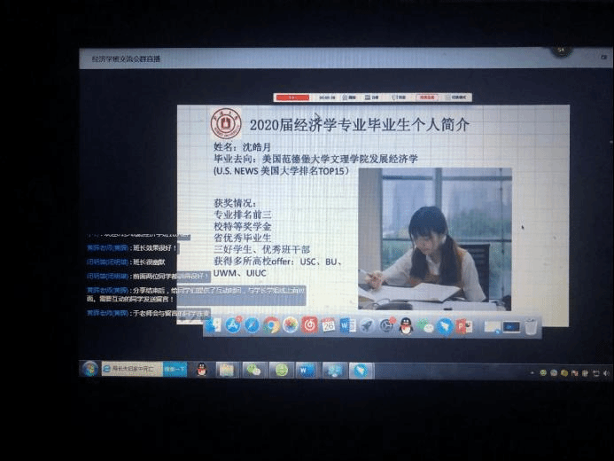 经济学作为经济类学科的基础专业,读研一直是学生的重要选择。在百家乐策略 的支持和关怀下,经济系逐步建立起了考研留学指导制度,并于2019年底专门成立了经济学会学生社团,通过不定期活动分享考研信息和经验,激发学生考研和留学的兴趣。在百家乐策略 和经济系老师的大力支持下以及班主任闭明雄老师和经济学会指导老师的共同努力下,今年的升学工作取得了喜人的成绩。2020届经济学专业毕业生36名,其中国内读研6人,出国留学5人,升学率达到31%,创历史新高。在毕业生即将离校之际,经济学会于6月26日下午组织了一场升学经验交流会,分别由2020届本专业毕业生中成功考研和出国留学的优秀学生向2017级和2018级有志升学的学弟学妹们分享奋斗的经验。本次交流会由经济学会负责人、2017级经济学专业班主任于冰主持,经济系教学系主任黄晖和2016级班主任闭明雄全力协调。由于正值毕业生离校之际,又是端午假期,本次交流会采取灵活的钉钉直播的方式开展。为了使同学们能熟练运用钉钉直播,于冰老师花费了大量的时间给学生一对一地指导,从而确保了交流会顺利地进行。