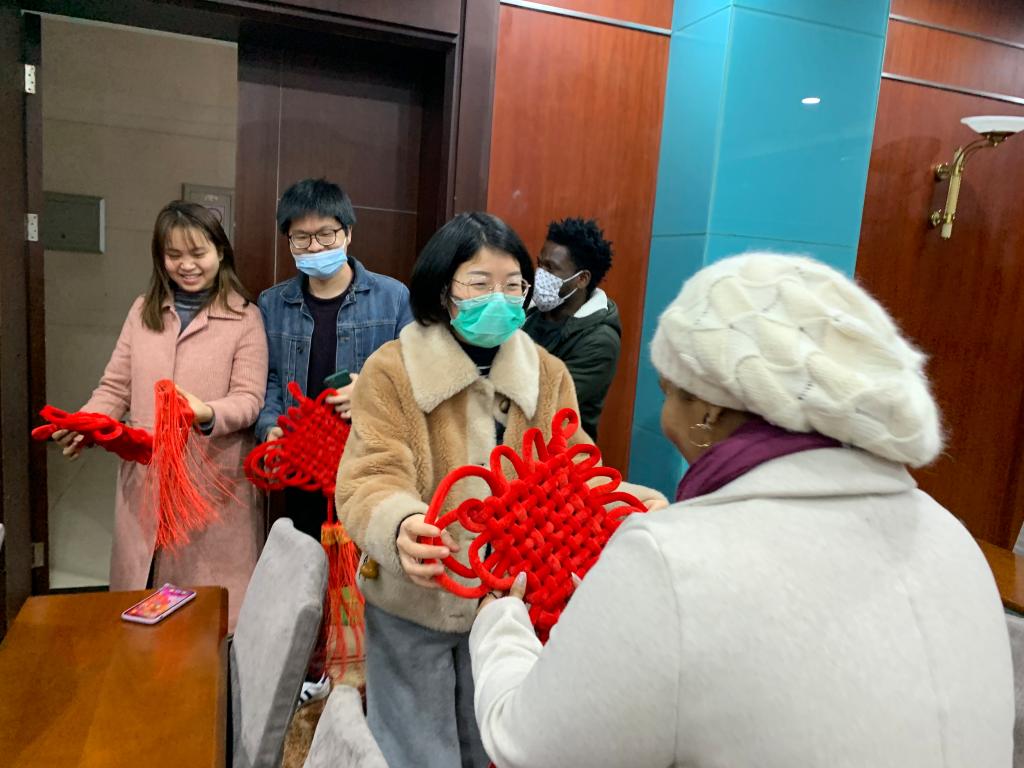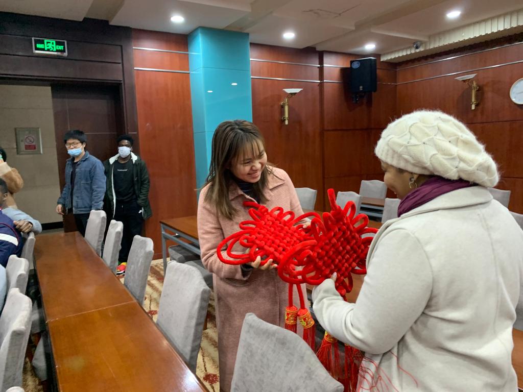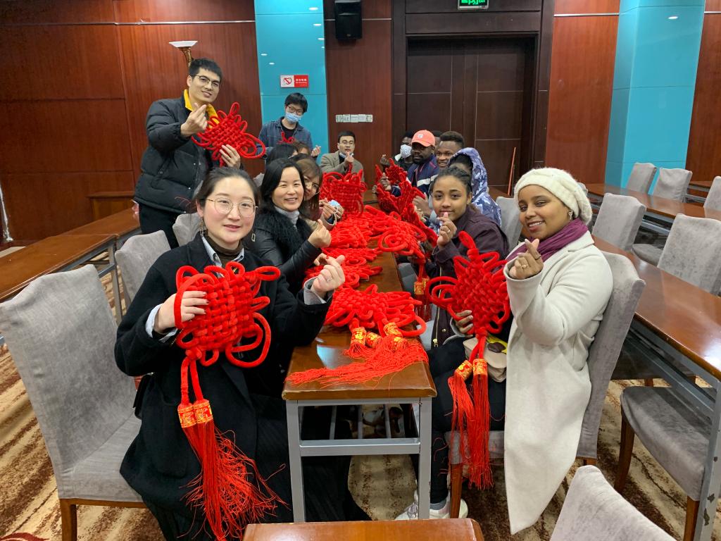 老师们向来自各国的留学生亲切介绍春节以及它的意义,并教留学生制作中国结,祝福留学生们度过愉快而有意义的新年。