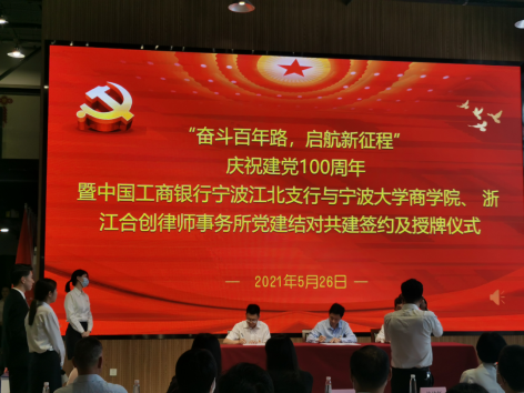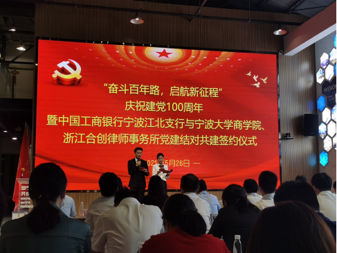 为庆祝中国共产党成立100周年,进一步加强基层党组织建设,探索党建共建新模式,构建银校企党建结对共建新格局。5月26日,百家乐策略 与中国工商银行宁波江北支行、浙江合创律师事务所在宁波文化创新港人才之家共同举办“奋斗百年路,启航新征程”党建共建结对活动。院党委书记史宏协、院党委副书记韩雯琛、江北区司法局局长林幼红、江北区司法局副局长欧金铨、工商银行宁波江北支行党委书记童晓松、浙江合创律师事务所党总支书记邓旭东及三方共建单位党员同志共同参加。会上,共建三方举行了党建共建签约授牌仪式,同时开展了红色主题教育活动。