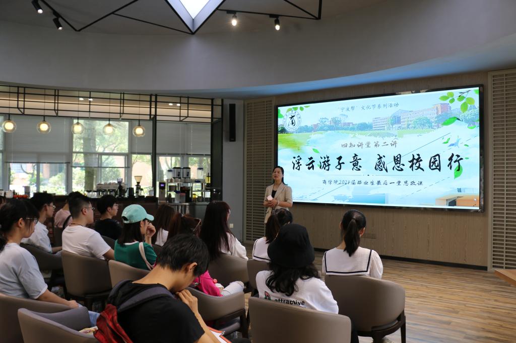 夏日终曲悠长,商院与宁大学子的故事不断,开展最后一堂思政课,培养爱校明史感恩之心,希望浮云游子奔赴远方,化别离为感恩,永远铭记宁大商院这片广阔天空。