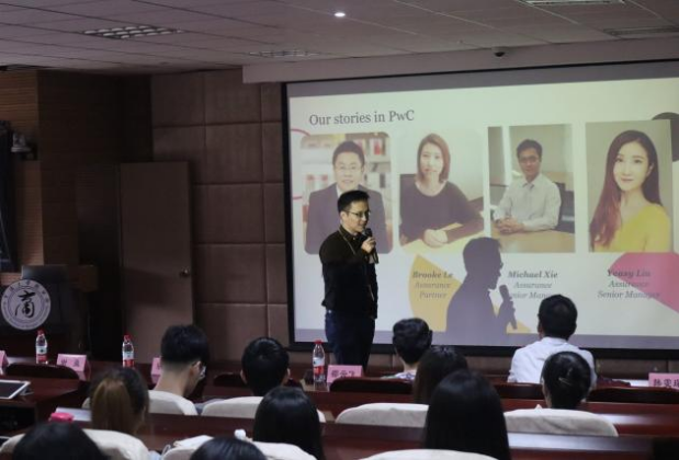 接着,合伙人乐乐从公司宗旨、部门构成、地区分布、员工人数等方面向同学们介绍了普华永道的总体情况,还详细讲解了公司所特有的岗位选择机制——创新领导力工程,让同学们对普华永道有了进一步的了解。