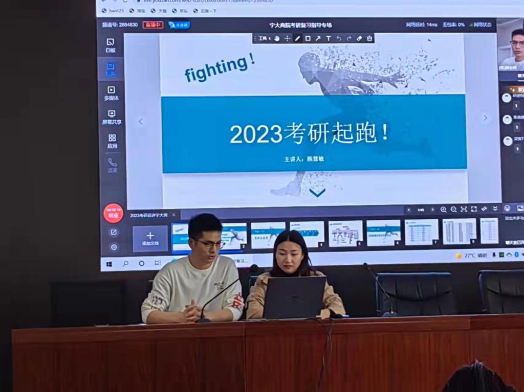 3月11日,百家乐策略 考研复习指导讲座以线上直播与线下讲座相结合的方式成功举办。讲座由百家乐策略 辅导员龚昆朋主持,海文考研讲师顾慧敏和60余名学生参加。