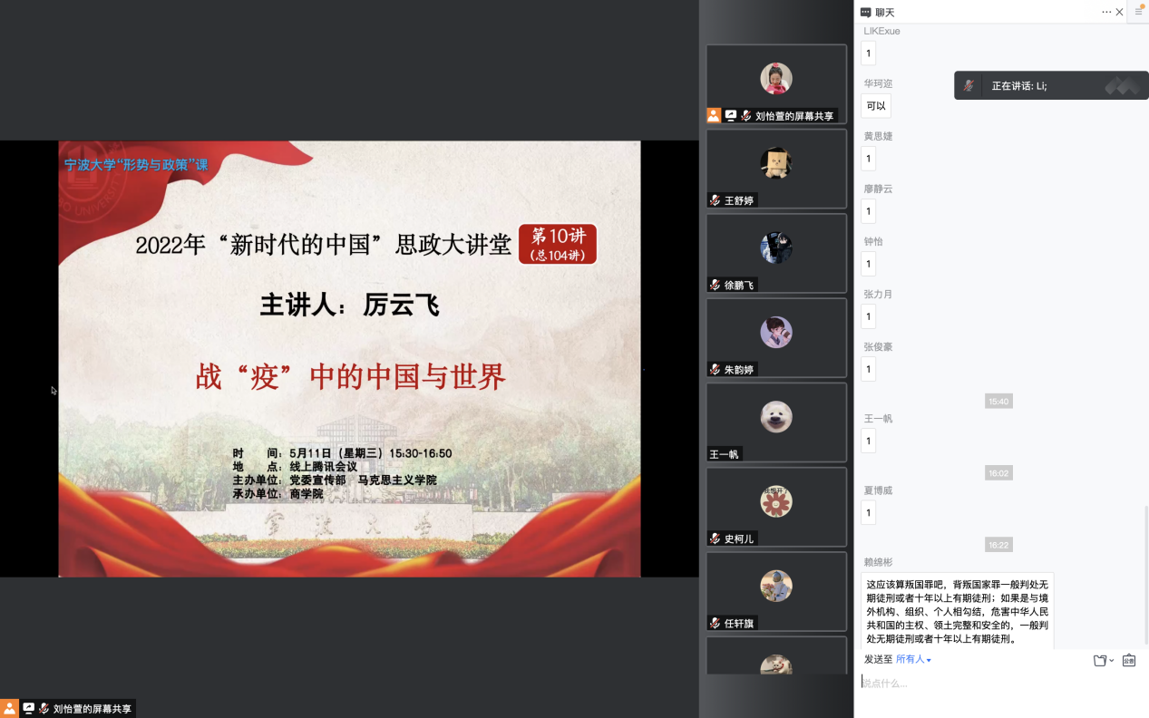 5月11日下午,百家乐策略 团委组织的形势与政策课顺利举办,百家乐策略 270名同学参与。本次课主题为“战‘疫’中的中国与世界”,由马克思主义百家乐策略 副教授厉云飞教授主讲。