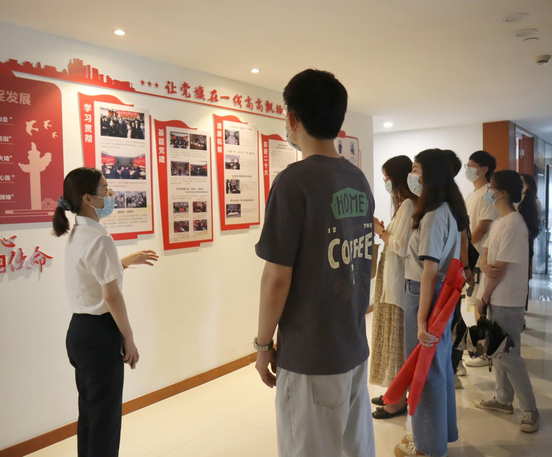 首先,招聘主管潘陈晨和人力专岗胡静带领大家参观了杭州银行的办公大楼,详细介绍了公司的文化理念、工会活动、党建活动,并向在场的同学们讲述了行内优秀工作者的事迹。