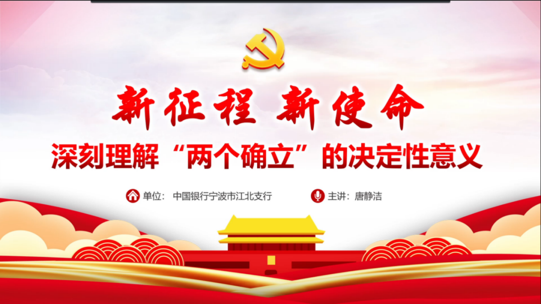 4月20日下午,百家乐策略 党委分党校第46期积极分子培训班通过线上钉钉会议的形式为各位积极分子呈现了一堂精彩的党课。中国银行宁波市江北支行的团委书记唐静洁作为主讲人,开展了题为《新征程 新使命 深刻理解“两个确立”的决定性意义》的课程内容。
