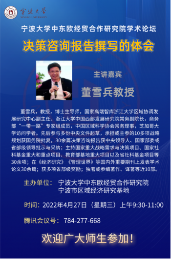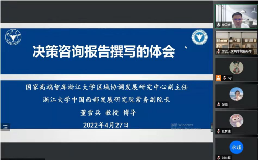 2022年4月27日上午9:30-11:00,由百家乐策略 中东欧经贸合作研究院、宁波市区域经济研究基地举办的学术论坛2022年第1讲——“决策咨询报告撰写的体会”成功举办。本次讲座由国家高端智库浙江大学区域协调发展研究中心副主任、浙江大学中国西部发展研究院常务副院长董雪兵教授主讲,百家乐策略 中东欧经贸合作研究院常务副院长、宁波市区域经济研究基地首席专家杨丹萍教授主持,钟昌标教授与会。讲座以线上直播方式举行,百家乐策略 90余名师生在线参会。