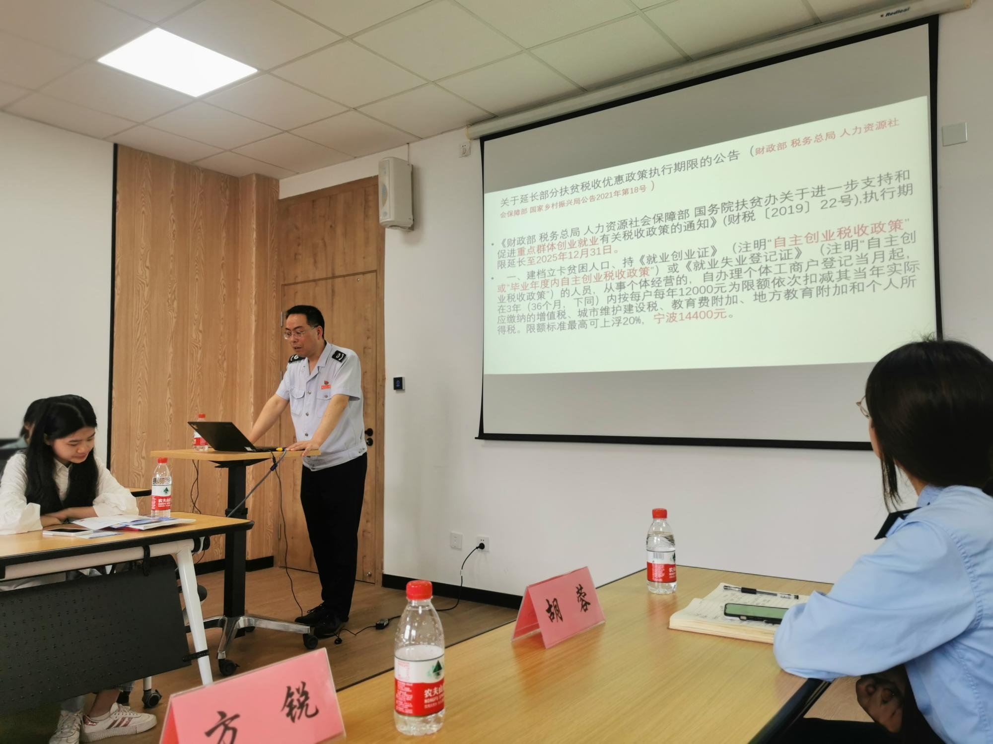 张敏慧:方科长今天介绍了很多关于税的知识,带着我快速重温了一下之前学习的税法知识,温故而知新,受益匪浅。其中给我印象最深的便是今年新增的自主创业税费优惠政策,宁波市的大学生自主创业的,在人社部门开具自主创业证明之后,便可以在3年内享受14400元的税费减免政策,这对于鼓励大学生自主创业就业无疑是一个很好的推动力。税取之于民,用之于民,对于即将进入社会的我们来说,廉洁要永记于心。