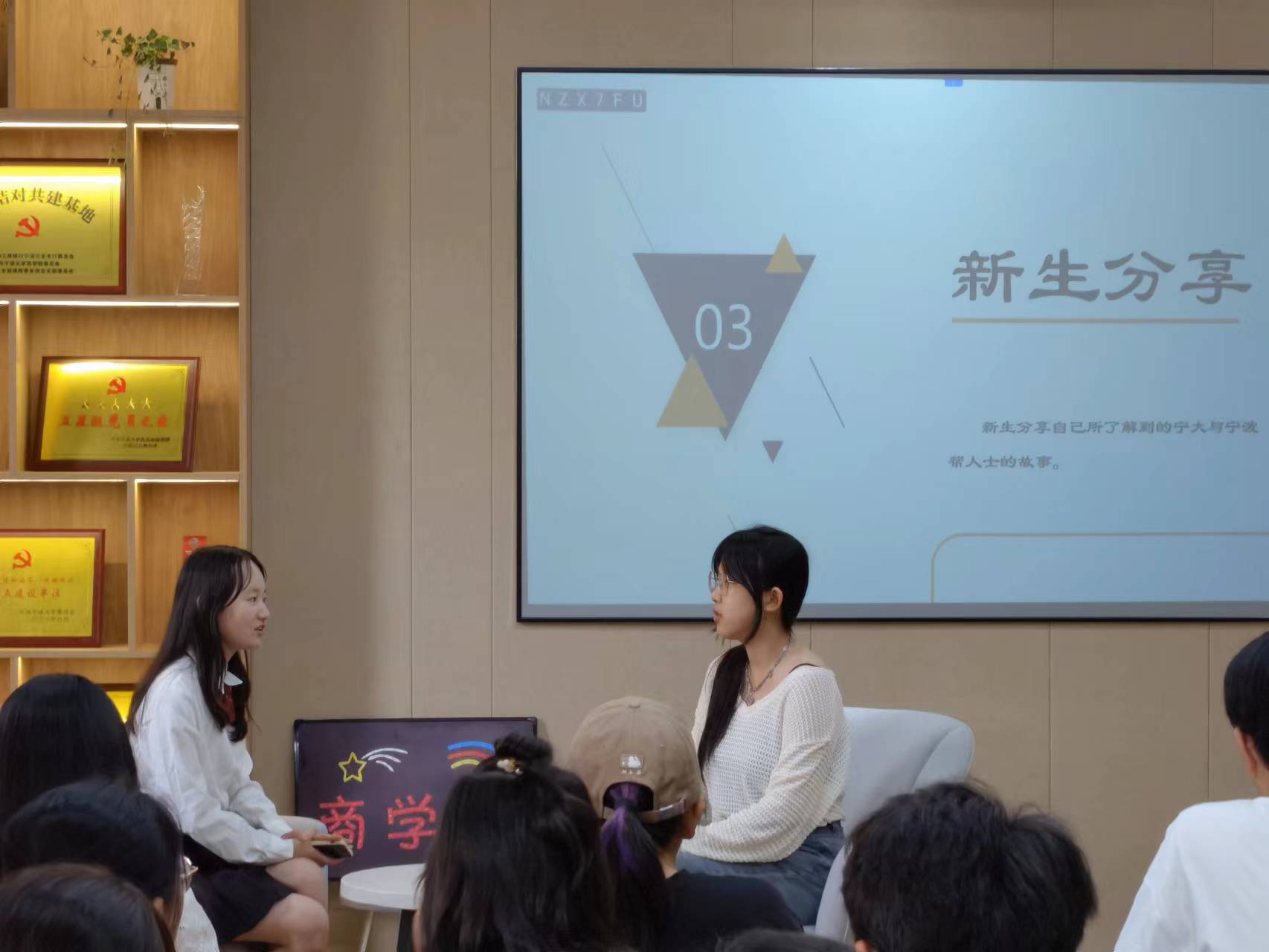 活动以文“话”商帮宣讲团成员录制的宣讲视频开场。宣讲团成员用图片与视频的形式模拟了校园情境,化身小导游,向新生一一讲述了宁大楼宇背后的故事,体会宁波帮人士与宁大的深厚情谊。