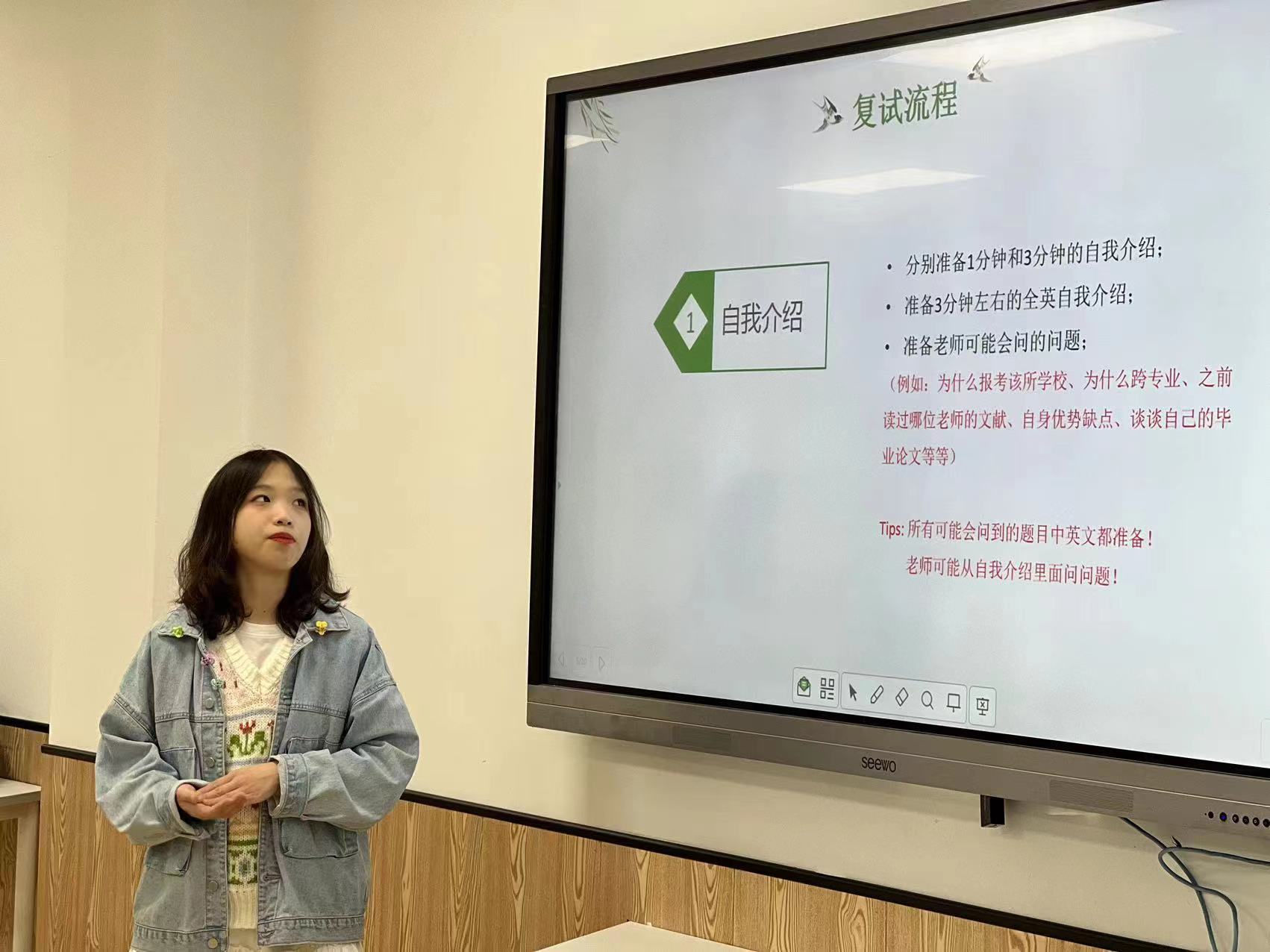 在活动过程中,李欣琪、方嘉彬两位同学依据自身经历为同学们介绍了复试的具体流程,传授了复试的经验技巧。李欣琪以考研上岸人的视角,对复试相关信息、流程及相应准备、注意事项进行详细的讲解,环环相扣,分享细密。方嘉彬围绕联系导师、复试专业课准备、调剂进行了心得分享,同时提醒大家在日常学习中要有意识地发散思维,在专业课学习中融入自己的想法。