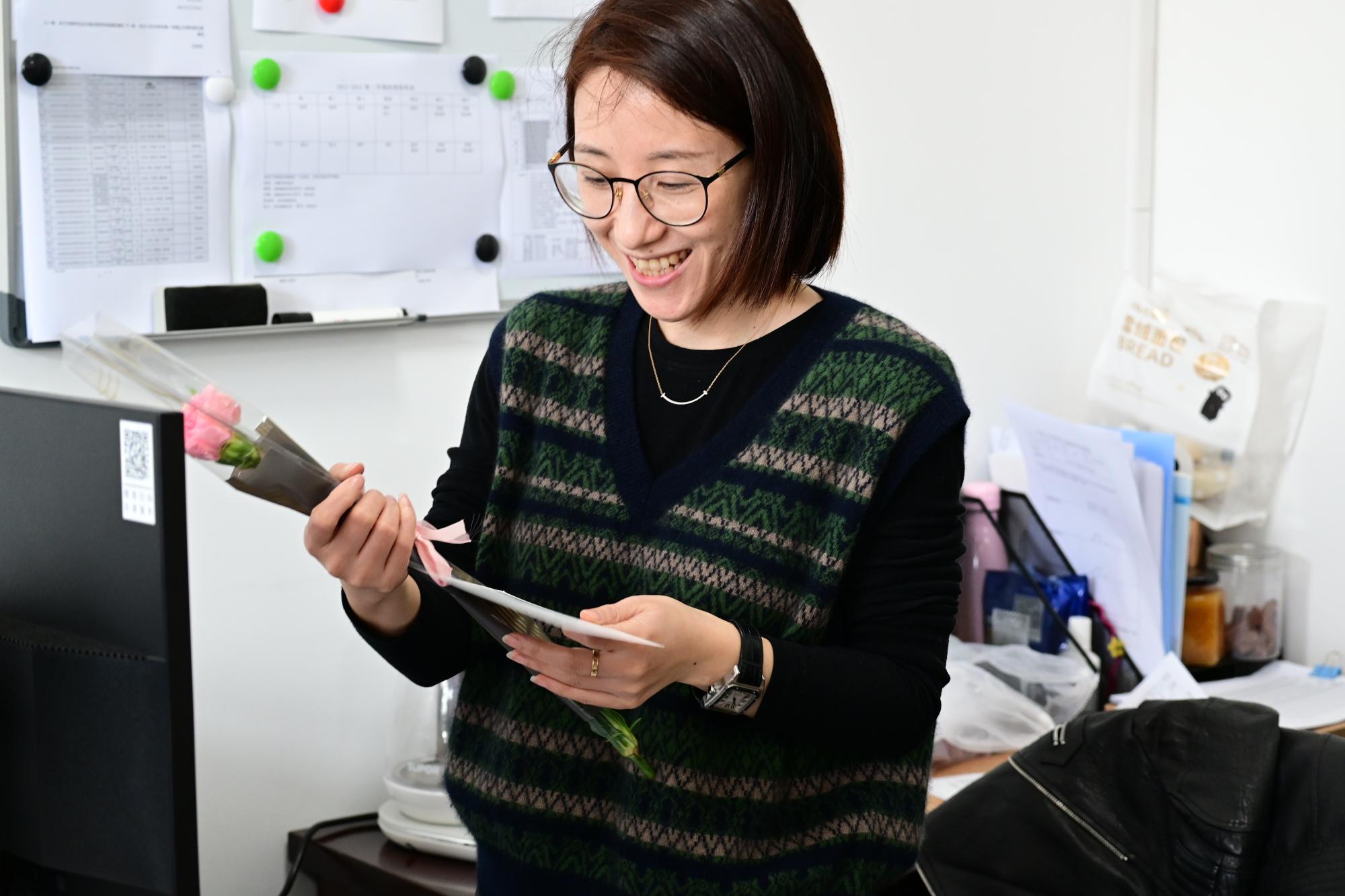 本次活动分成两个部分,首先向女教师送上祝福,前期通过微信公众号收集同学们对女老师的美好祝愿。节日当天,同学们精心准备了鲜花和贺卡,“一束鲜花献真情,一张贺卡送祝福”,为女老师送上献花和贺卡,表达对老师默默耕耘、辛勤付出的感恩之情和尊敬之意。其次是由班级男同学为女同学书写专属明信片,在这个特殊的节日里表达祝福,女生们收到明信片,备受感动。
