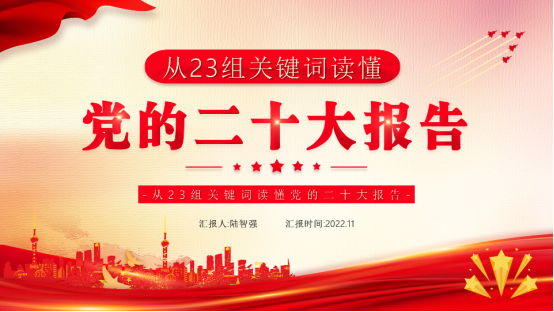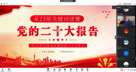 首先,由会计系党支部书记陆智强和于瑾滔同志共同作了题为“从23组关键词读懂党的二十大报告”的专题报告。报告从党的二十大报告文本出发,梳理出贯穿文本中的23个关键词,包括:大会的主题、新时代十年的伟大变革、三件大事、马克思主义中国化时代化新境界、全面建成社会主义现代化强国、中国式现代化、加快构建新发展格局等,并对这些关键词进行细致的解读。两位老师在党课中结合社会上近期发生的热点问题,深入浅出地阐述了我党在过去取得的成绩,以及未来关心的问题,让与会党员深刻认识到在中国共产党领导下建设中国特色社会主义的优越性。