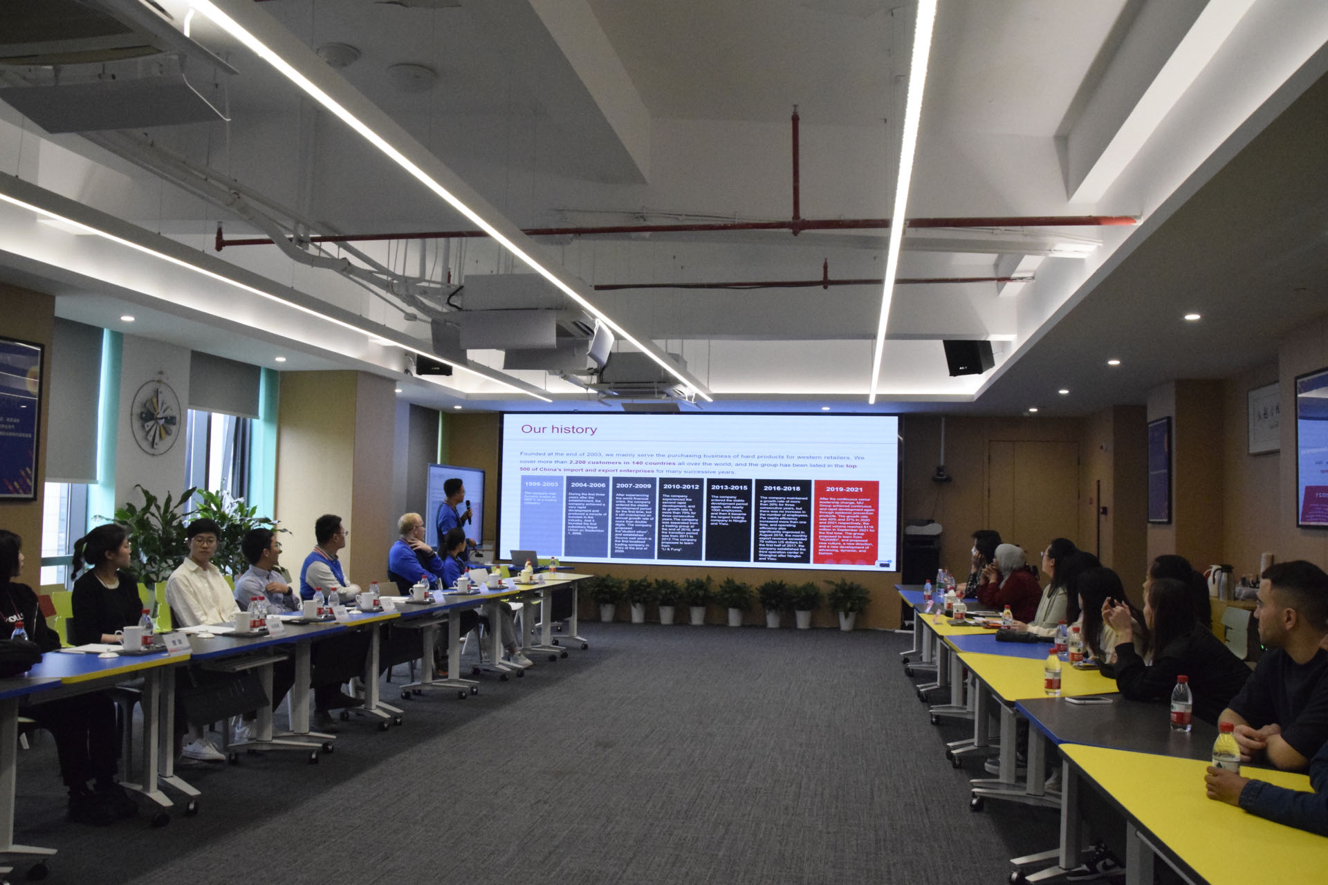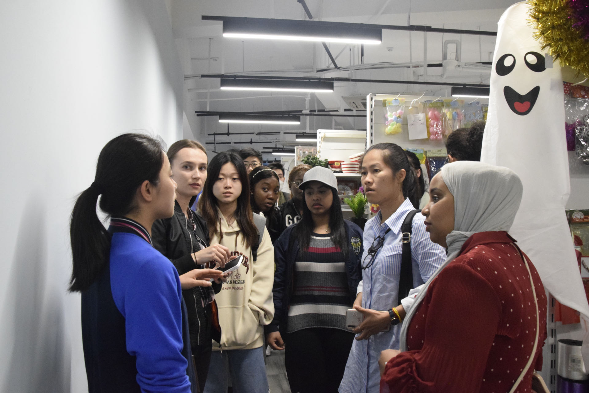 在工作人员的热情引导下,一行人参观展品区,英朗国贸副经理温玉琼向留学生们介绍公司的布局、各个部门的工作环境,使同学们对公司的工作环境有了初步了解。随后,温玉琼向留学生们介绍了外贸相关知识与实践。