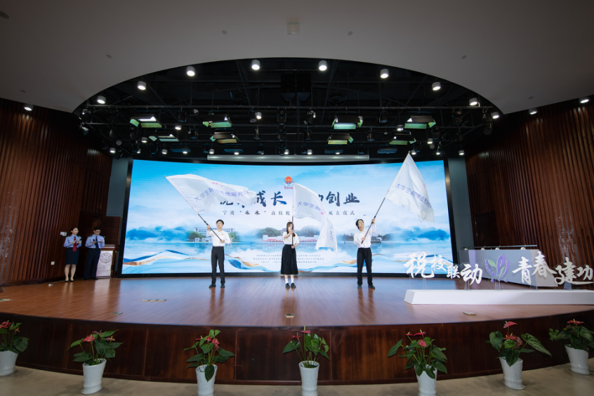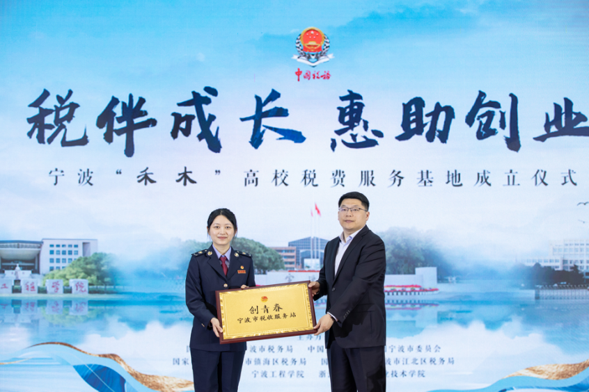 计允斌为宁波市税务局团委授“创青春”宁波市税收服务站牌,为三所高校的大学生税收志愿服务队授旗。三支队伍成员后续将分批次赴办税服务厅开展税收志愿服务工作。
