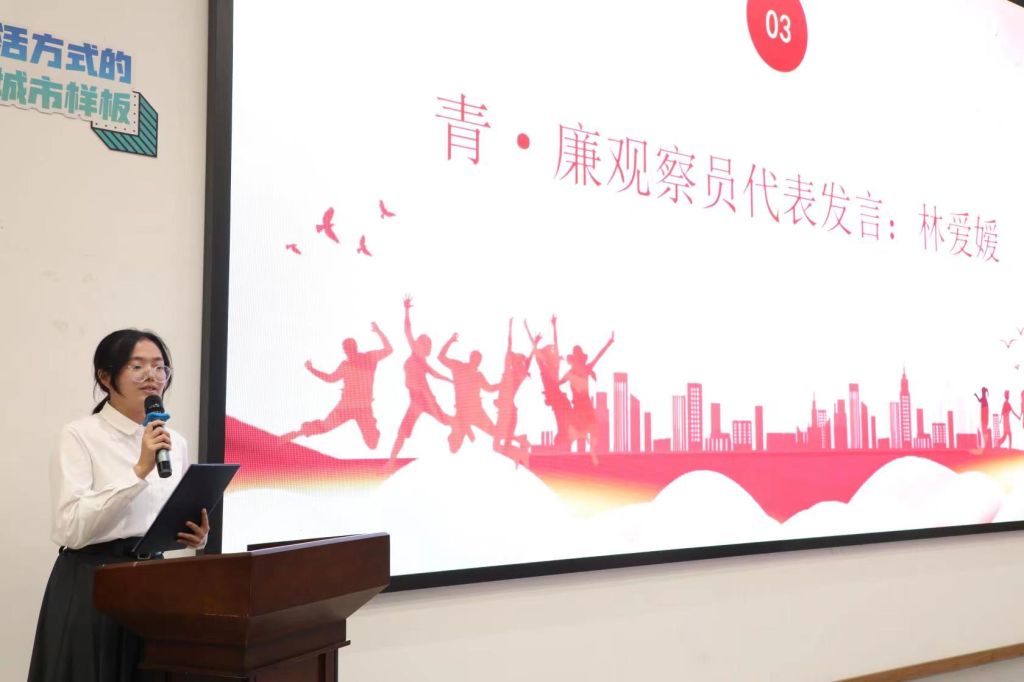 百家乐策略 本科生第三党支部的林爱嫒同学作为“青·廉观察员”代表发言,她表示很荣幸能成为“青·廉观察员”里的一员,之后将会积极配合小镇做好监督检查工作,为维护小镇清廉文明的健康生态圈,提出自己的意见建议,为清廉商院、青·廉小镇建设贡献自己的智慧与力量。