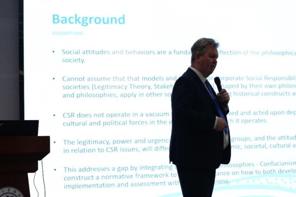 最后堪培拉大学商政法百家乐策略 工商系主任洛恩·卡明斯教授带来了“关于企业社会责任的哲学思考”。儒家思想、法家思想和道家思想在企业社会责任(CSR)的实践中相互交融,形成了独特而有益的关系。儒家的强调社会伦理和关爱他人的价值观,法家的侧重法治和权威引导企业遵守法规、维护公正,而道家的强调自然和谐则鼓励企业追求可持续性和生态责任。这三者的融合为企业构建了一个有利于企业和社会共同繁荣的理念体系。
