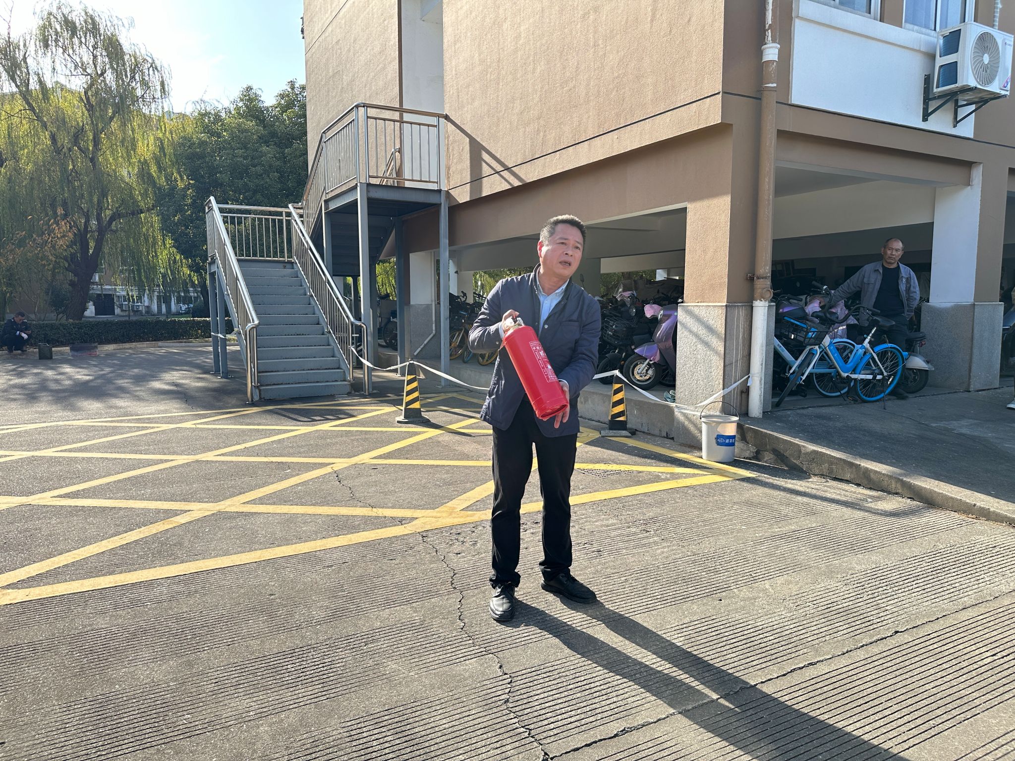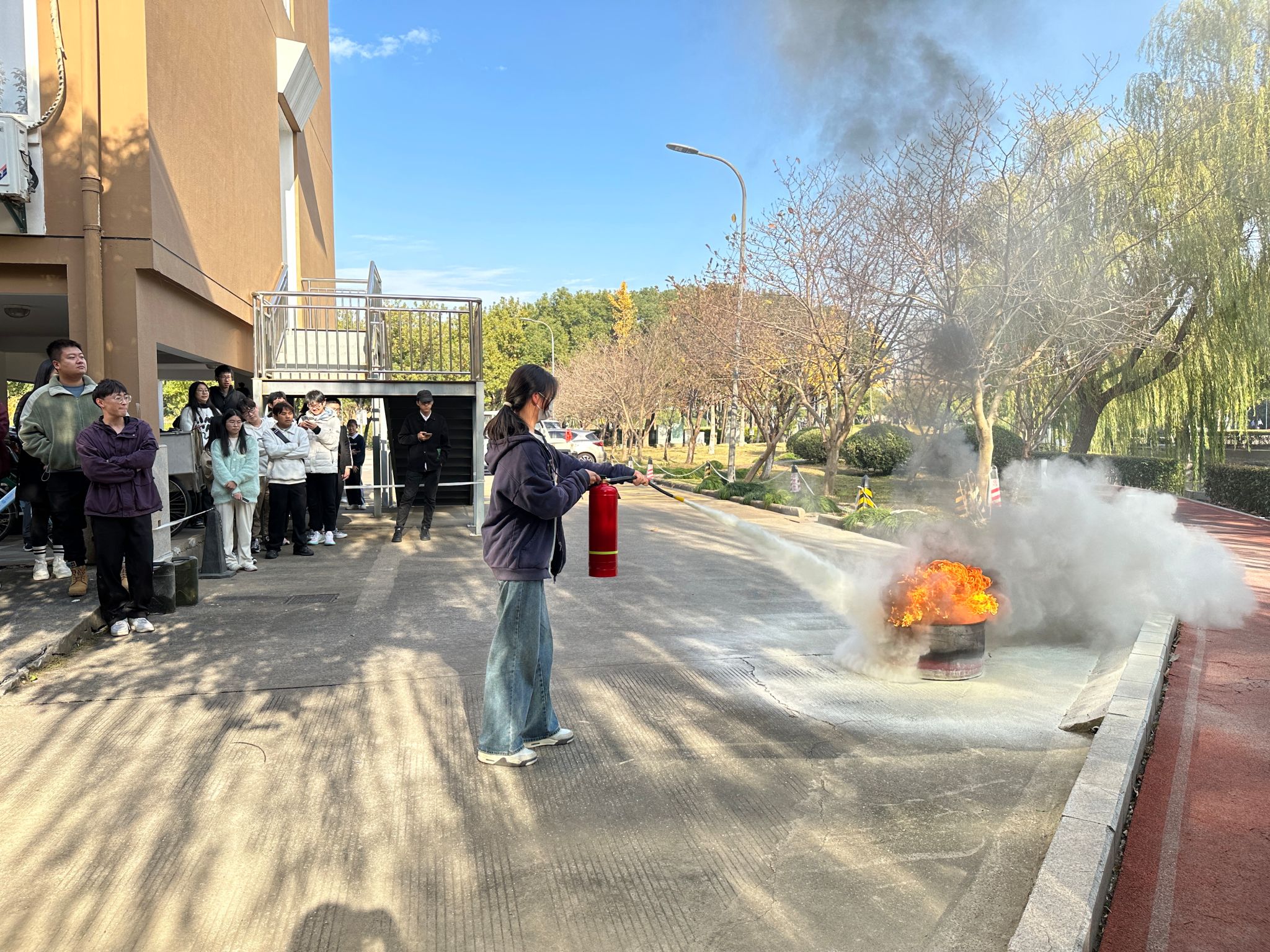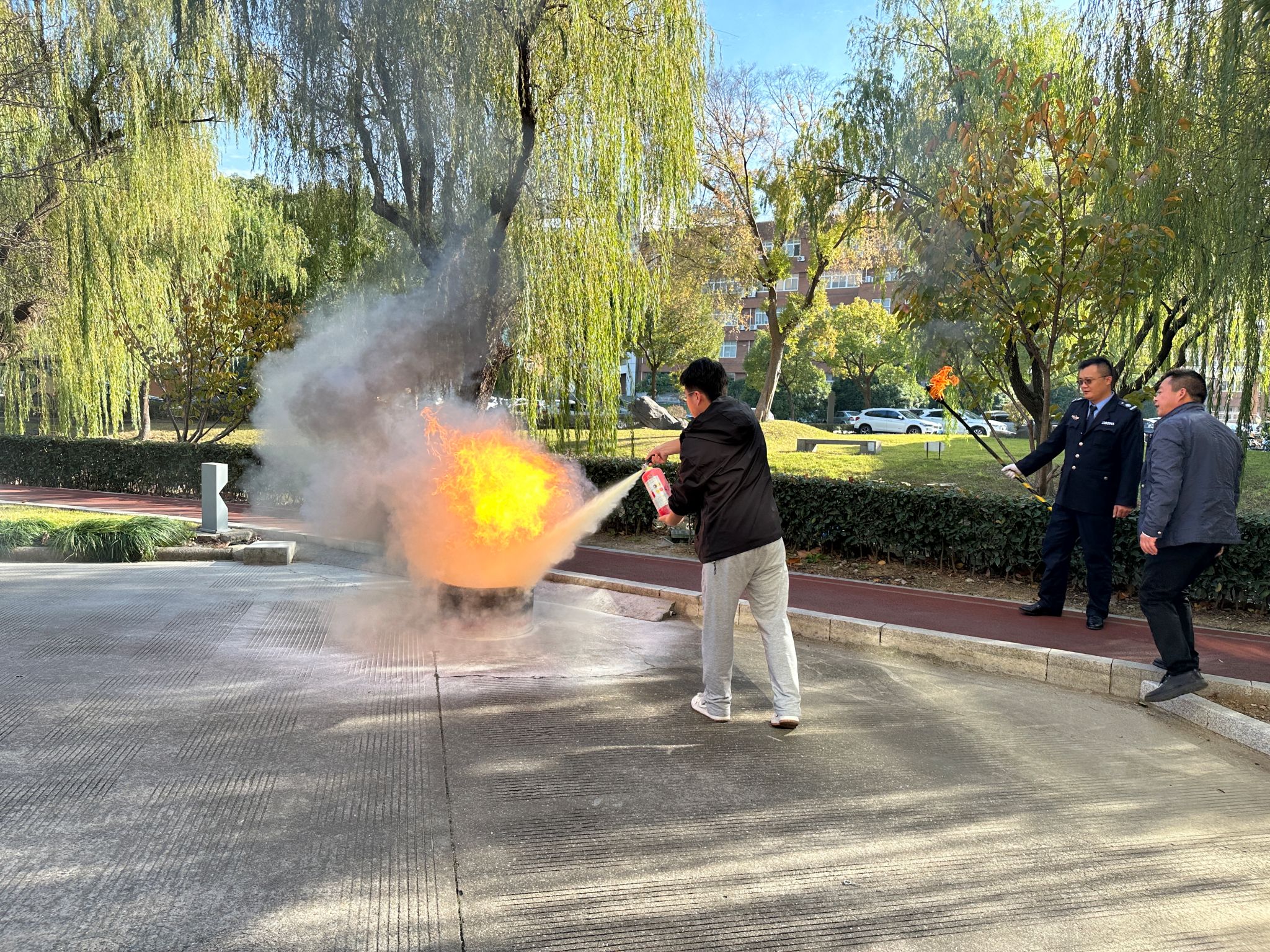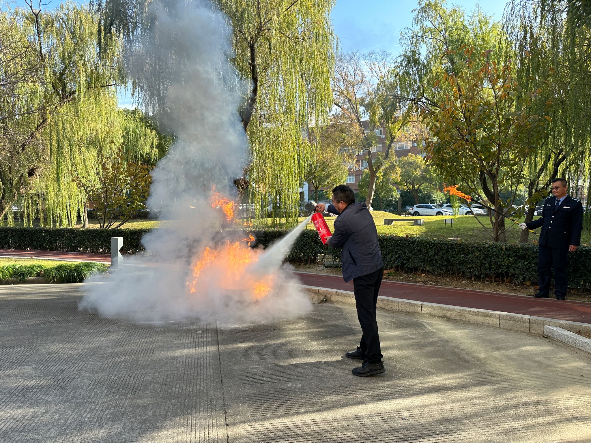为了使同学们更好理解灭火器的使用方法,现场准备了柴油桶、柴油等道具模拟火情。郑永辉在演练道具柴油桶中倒入水和柴油,火焰熊熊燃烧后,郑永辉亲自示范了正确使用灭火器的方法。