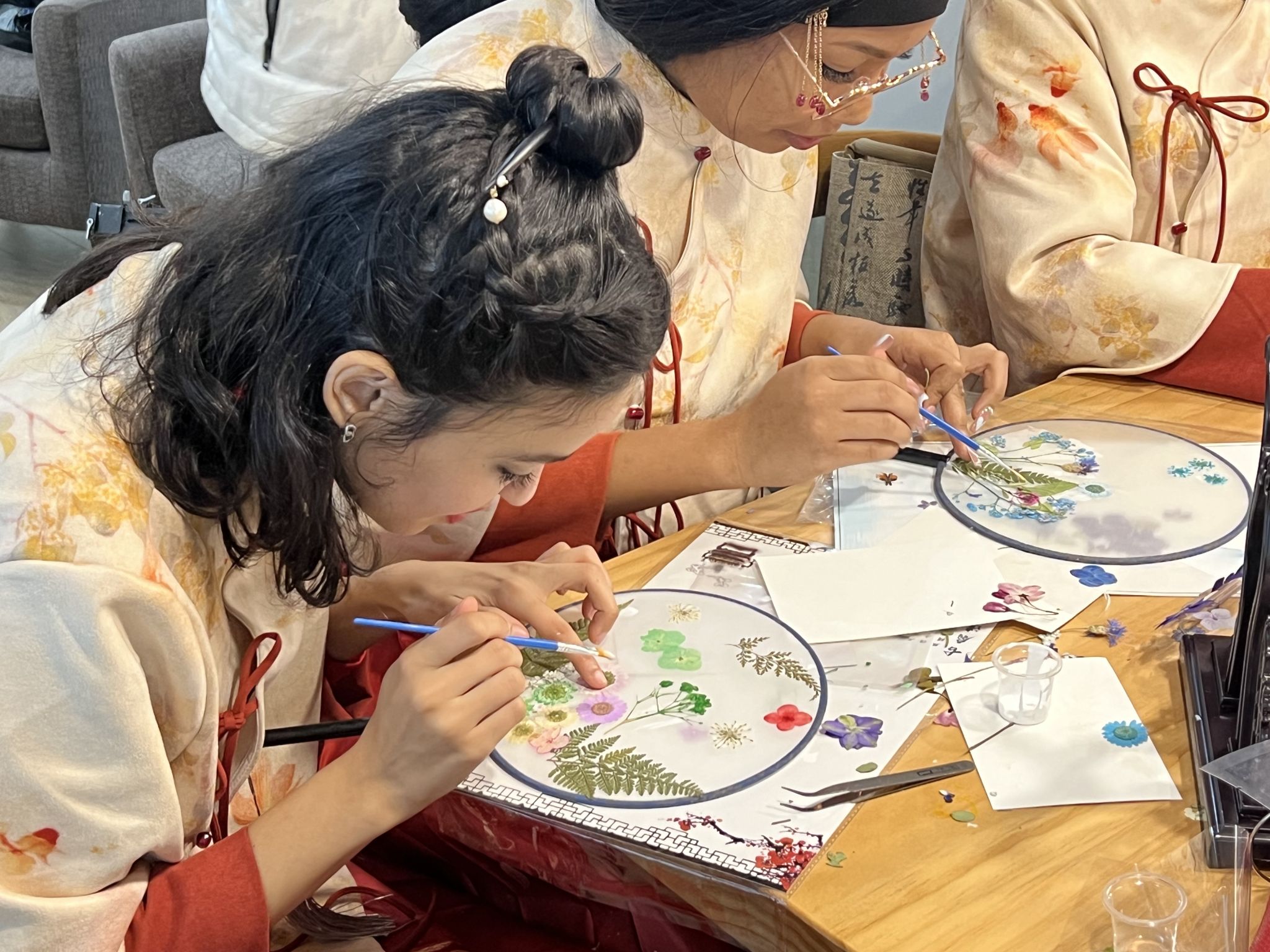活动伊始,老师首先对团扇的发展历程作了简要介绍,并结合PPT演示讲解了扇面材质、图案特点、制作步骤等团扇相关知识。在老师的指导下,学生们纷纷拿起空白扇,开动小脑筋,自由搭配色彩将装饰物黏贴在扇子上,期间,学生们放松身心,充分发挥想象力,指导老师们一边看,一边给予适当帮助,虽然操作不够娴熟,但大家都十分认真,努力呈现出最好的效果,场面温馨满满。在快乐的氛围里,一幅幅精美的团扇“独具一格”,富有韵味,大家纷纷向指导老师们展示自己的作品并合影留念。
