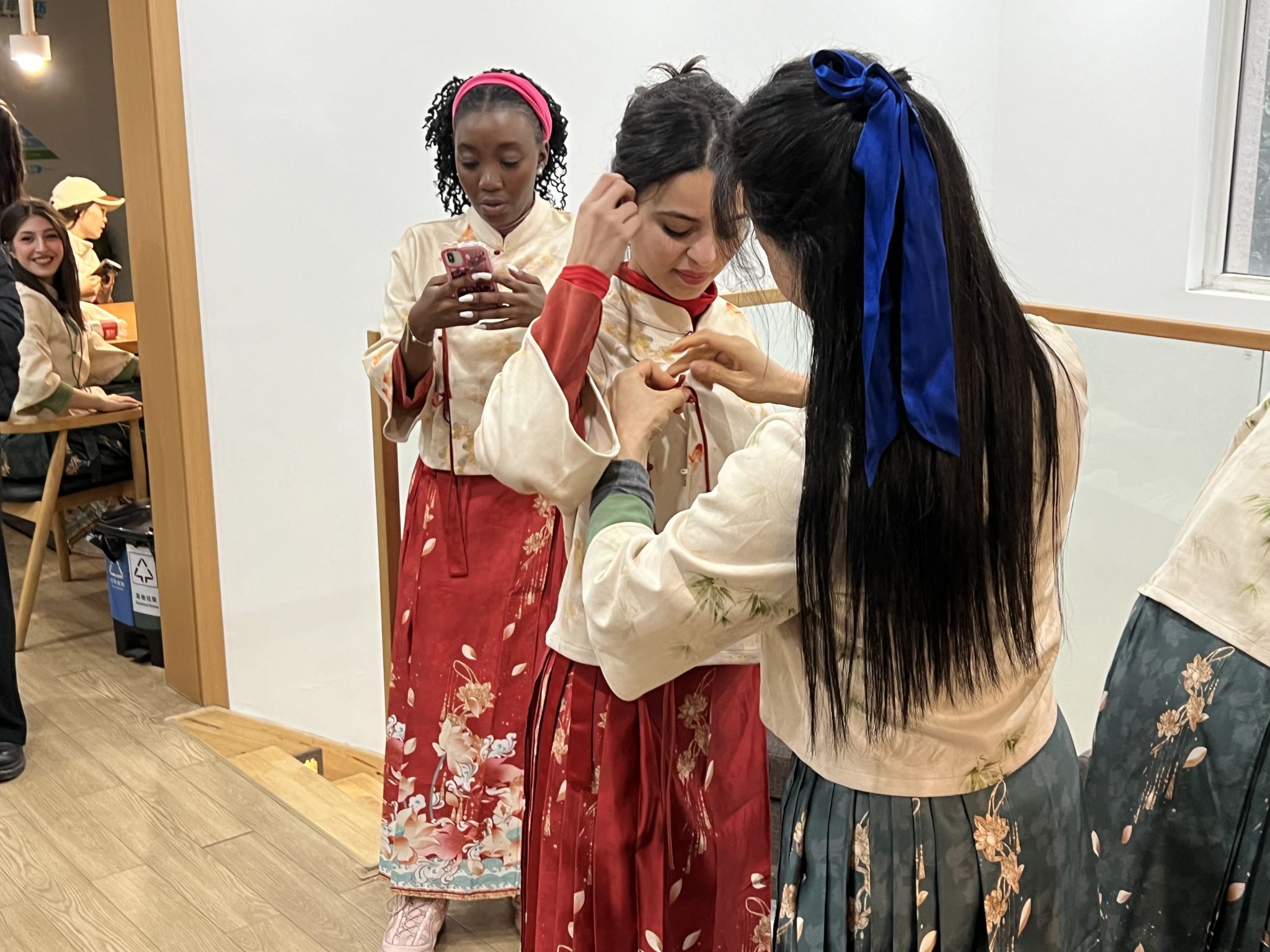 活动由汉服——马面裙试穿体验开始,留学生的自我介绍和服装配饰搭配给马面裙试穿环节增添了别样的乐趣,部分学生还提出在活动结束后想购买马面裙的意向。
