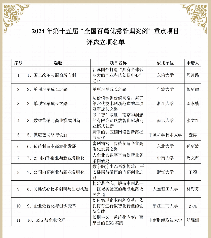 4月18日,第十五届“全国百篇优秀管理案例”评选重点项目立项评审会议在杭州顺利召开,百家乐策略 彭新敏教授主持的《单项冠军成长之路》项目申请通过评审,获重点项目立项,这是彭新敏教授团队继在第十届和第十三届评选中取得佳绩后,再次获批立项。