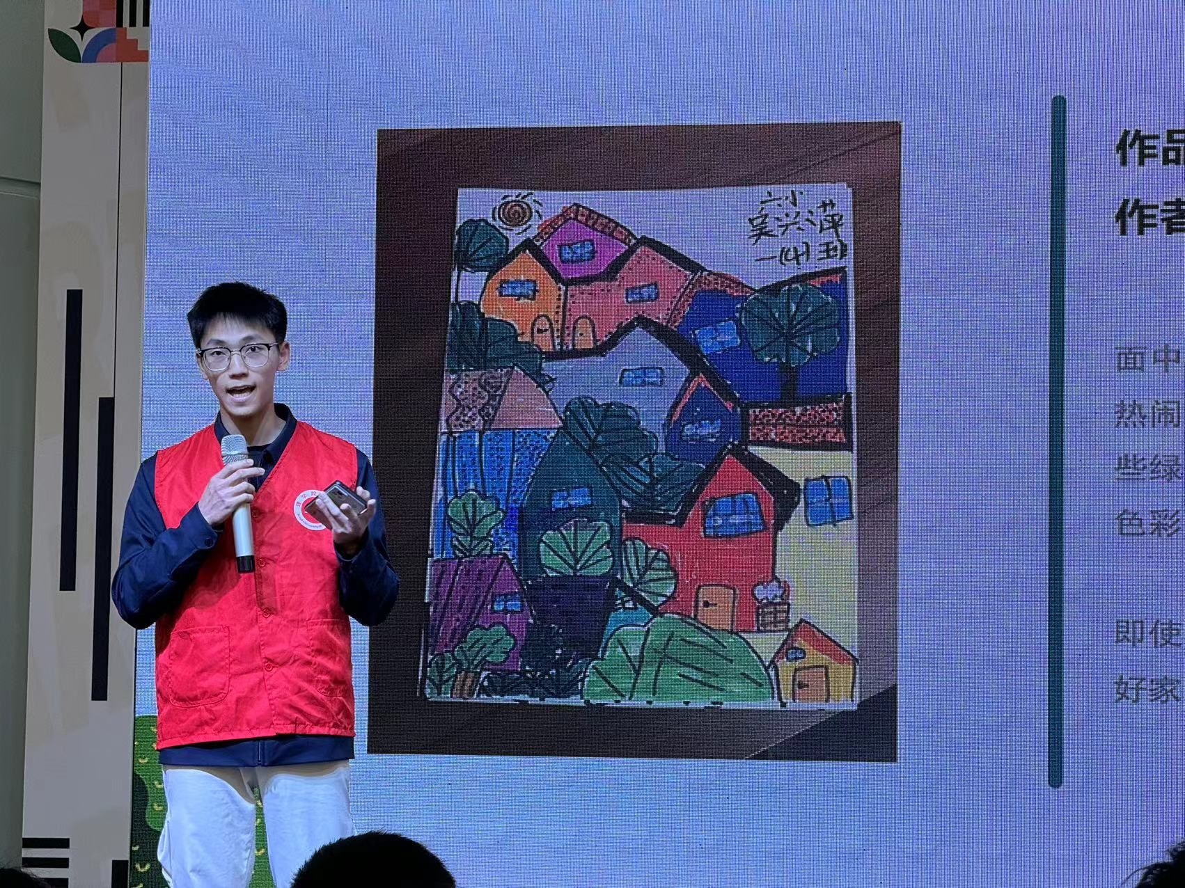 “这幅作品来自一位一年级的小朋友,她的爸爸妈妈常年在广州打工,她想造一座移动的城堡,可以随时见到爸爸妈妈,跟他们生活在一起,起拍价30元。”“50元、100元、110元······”志愿者们热情介绍,“买方”竞拍踊跃,纷纷献出自己的爱心。