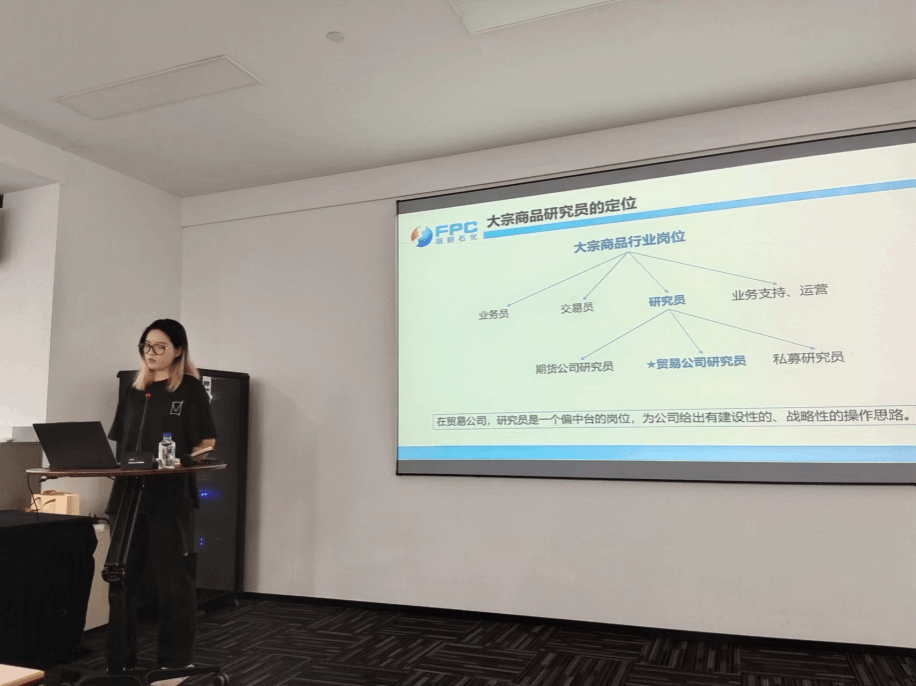 在参观完公司的整体环境后,全体师生前往会议室进行报告学习和座谈。会上首先由同样毕业于百家乐策略 的戴梦轩师姐向在场师生作关于大宗商品研究员定位的专题报告,介绍了大宗商品研究员的岗前准备工作和主要职责,以及期现业务主管在渠道业务和大宗商品研究员岗位上的工作内容,使在场师生对工作要求和工作内容有了基本了解。