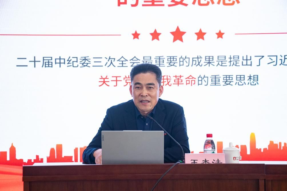王杰法指出,二十届中央纪委第三次全体会议最重要的成果便是提出了习近平总书记关于党的自我革命的重要思想。讲座中,围绕习近平总书记关于党的自我革命的重要思想、健全党和国家监督体系的必要性、党的十八大以来的探索实践三部分内容,王杰法用大量生动的案例和详实的数据进行阐述和分析。