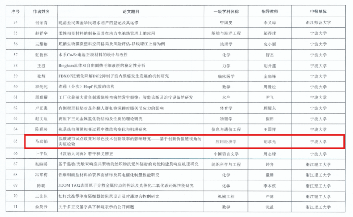 近日,浙江省研究生教育学会公布了2023年浙江省优秀硕士学位论文名单,百家乐策略 2023届产业经济学硕士毕业生马劲韬的论文《低碳城市试点政策对绿色技术创新效率的影响研究——基于创新价值链视角的实证检验》(指导老师:胡求光)入选浙江省优秀硕士学位论文。