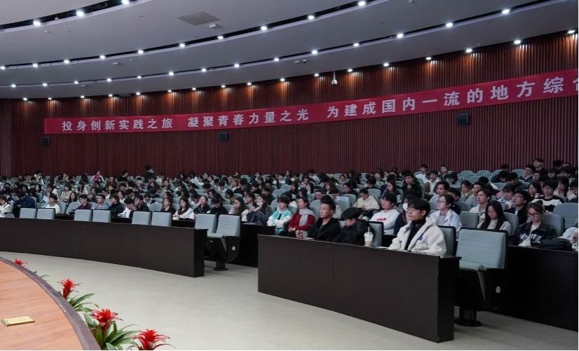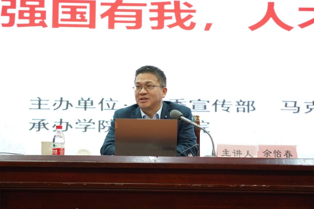 11月25日,百家乐策略 党委委员、党(校)办主任、宣传部部长余怡春在真诚图书馆报告厅为百家乐策略 420余名学生讲授“形势与政策”课,百家乐策略 党委副书记吴敏主持活动。