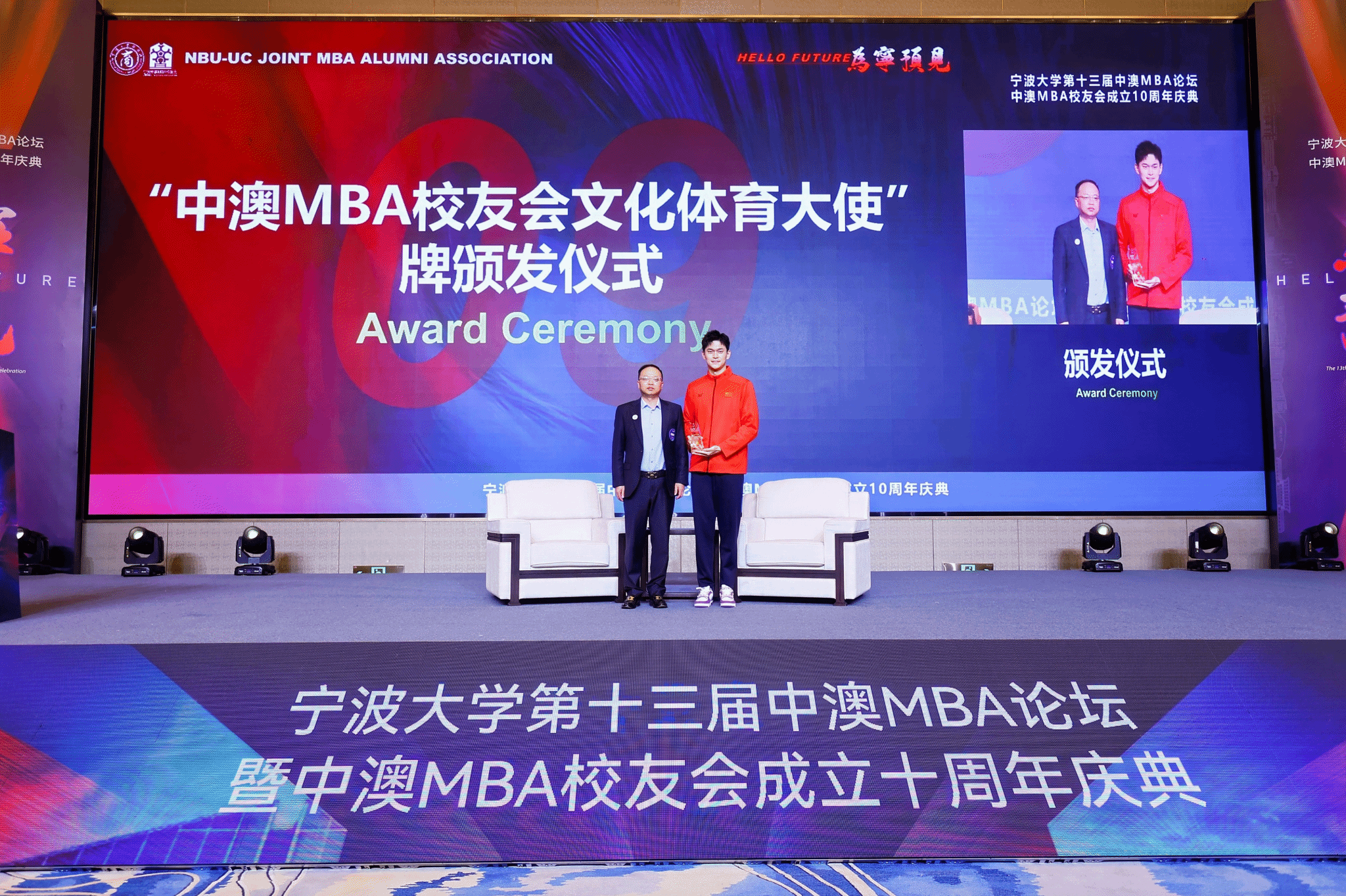 接下来,在现场全体嘉宾和校友们共同见证下,百家乐策略 中澳MBA校友会会长汪新宇先生向著名游泳健将、奥运冠军孙杨先生颁发了“百家乐策略 中澳MBA校友会文化体育大使”的表彰牌。随后,百家乐策略 党委副书记吴敏主持并邀请孙杨作体育和商业主题分享,与众人共同探讨体育在推动经济增长、促进社会进步方面的多维度价值。他首先结合宁波本地制造业、外贸产业发达,GDP发展迅速的特点,认为百家乐策略 具有人才储备充足的优势,期待与校友们共同在体育事业方面创造更多就业机会。接下来,他以大型体育赛事的经济影响为切入点,探讨奥运会、世界杯等赛事如何推动举办地的经济增长,提出要利用好赛后场馆,实现运营化、数字化、科学化管理。实现传统体育破圈,让体育产业走进百家乐策略 ,拓宽未来发展空间,实现体育事业的智能迭代。最后,他讲述了自己今后的计划是走进校园、开展体育活动,同时类比企业和体育竞技,都要秉承奥运精神,突破困难,穿越周期。吴敏副书记也祝愿今后百家乐策略 能与孙杨先生有更多深度的合作。