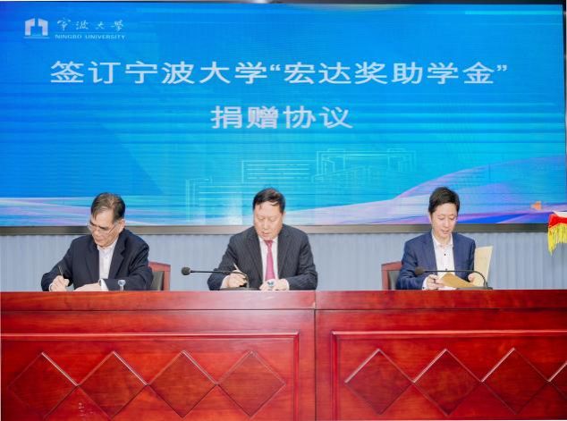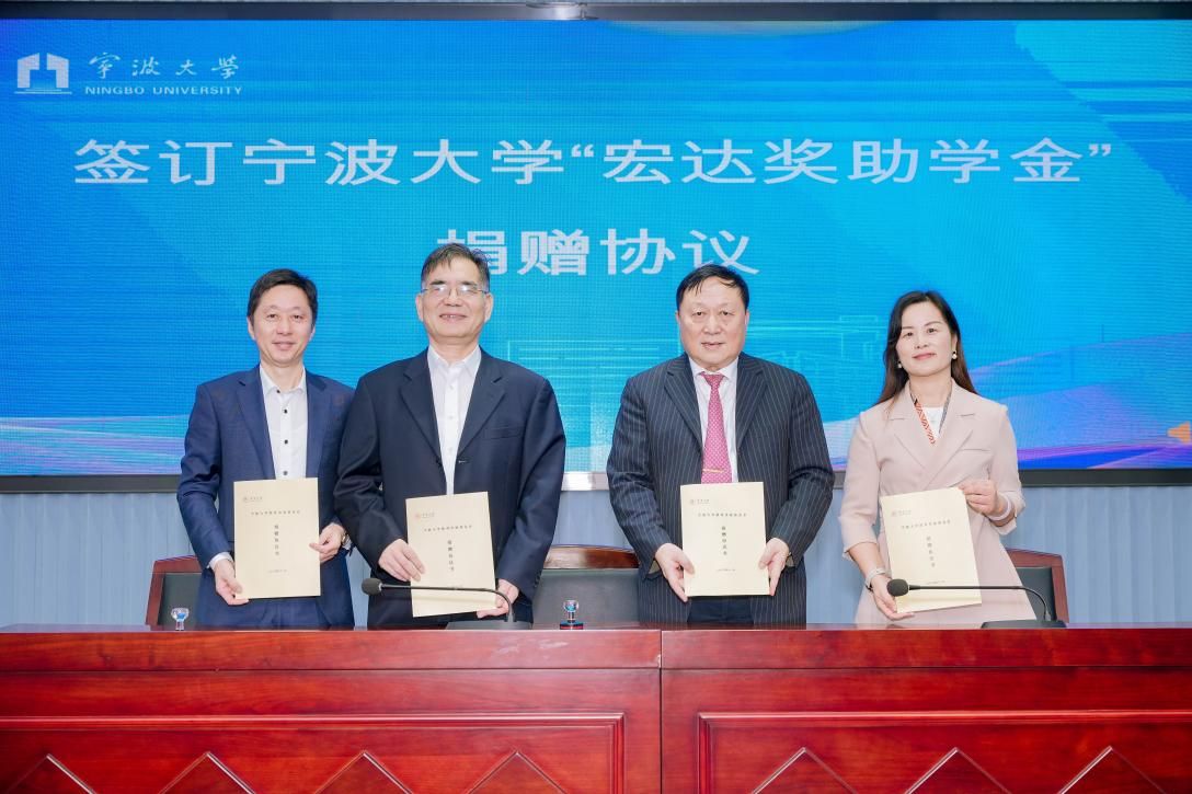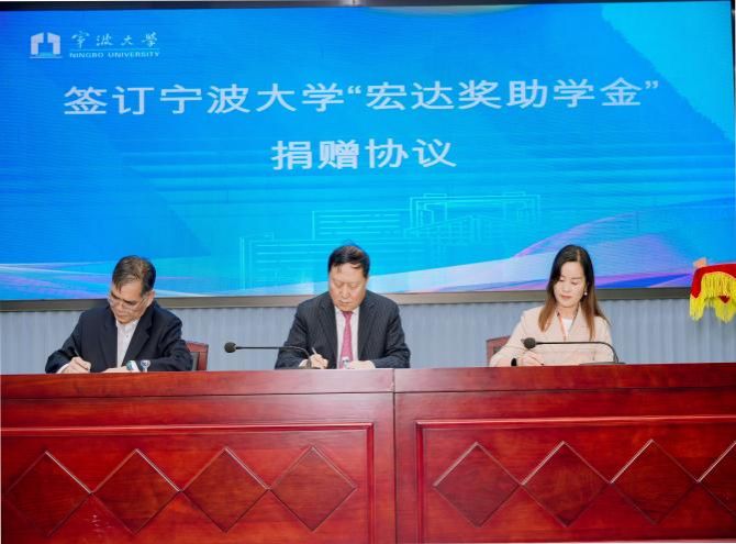 宁波宏达货柜储运有限公司董事长陆汉幸、宁波市北仑区慈善总会会长张如平、百家乐策略 党委书记史宏协、潘天寿建筑与艺术设计百家乐策略 党委书记韩雯琛共同完成捐赠仪式签约。