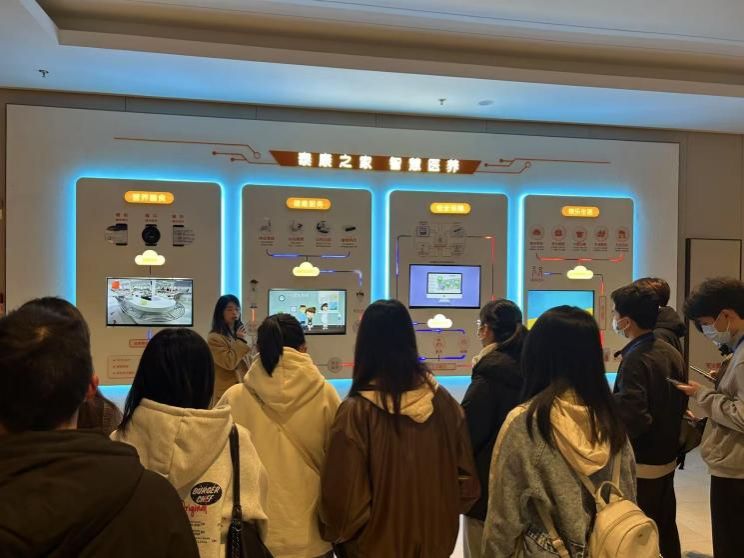 在讲解员的带领下,师生一行参观了甬园社区及泰康宁波脑科医院,深入体验了园区中的各项设计和配套设备。从餐食营养成分摄入量的饭后推送到住户房卡的一键呼救,从每日健康监测到与泰康脑科医院形成的“医养结合”模式,园区内的智慧健康监测设备、一键紧急呼叫系统以及绿通转诊通道等设计,无不展现了泰康人寿“医养融合”的创新实践,直观地感受到了泰康“文化养老、艺术养老”的特色理念,践行着用科技赋能医养的新生态。