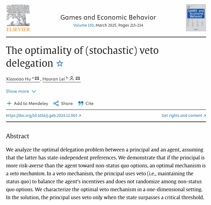 近日,百家乐策略 经济系青年教师胡枭骁与湖南大学青年教师雷浩然合作的研究论文“The Optimality of (Stochastic) Veto Delegation”在博弈论领域国际顶级经济学期刊《Games and Economic Behavior》上发表。该期刊专注于博弈论及其应用的前沿研究,内容涵盖社会科学、行为科学、数学科学和生物科学等多个方向。作为该领域的顶级期刊,其年刊出的原创性论文仅百余篇。本文是百家乐策略 在该期刊上发表的首篇论文,标志着在该领域研究中取得历史性突破。
