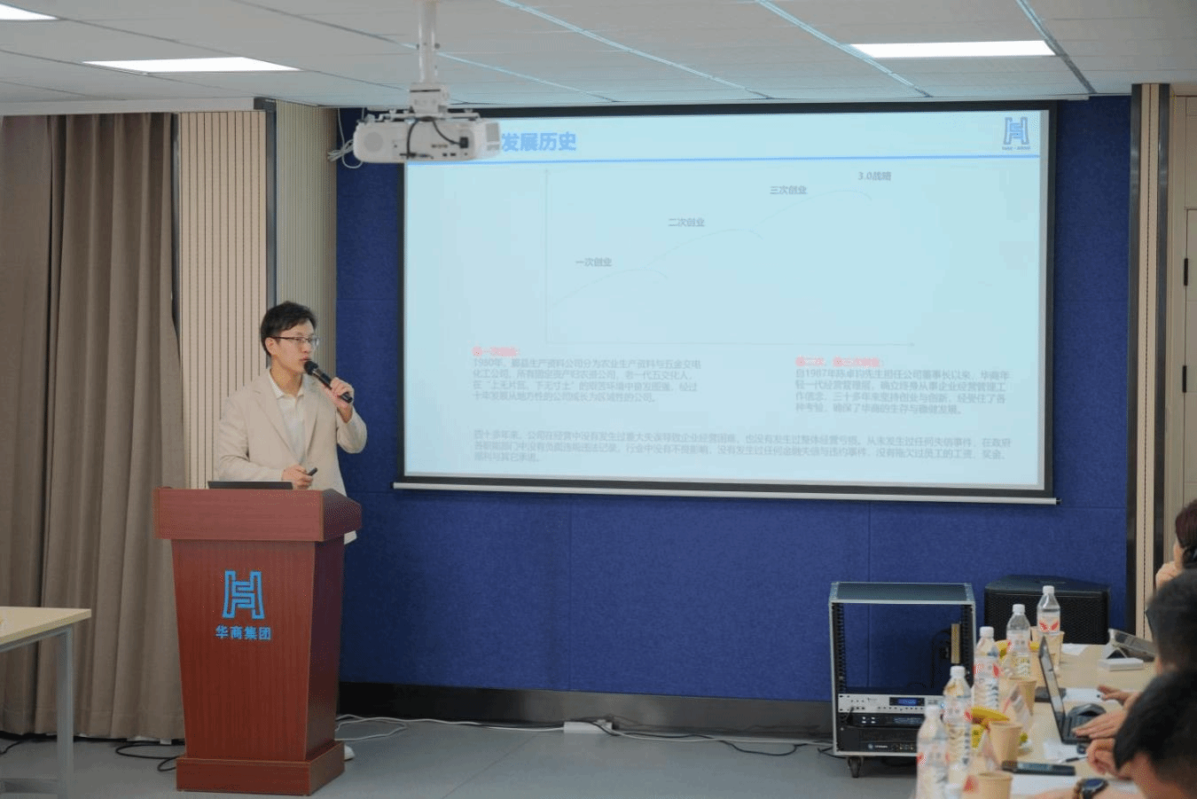 随后华商控股集团陈峰总裁做《华商集团文化与传承》主题分享。他首先梳理了华商集团的发展历程,通过关键节点的回顾,展现企业从创立到成长的阶段性成果,奠定文化传承的历史根基。接着讲述个人使命的传承:以先祖为鉴,践行社会责任。以陈哲森、陈哲吉等先祖为例,体现出回馈宁波、投身民族复兴的使命,设定短期 “百亿华商”、长期 “百年华商” 目标。还深入探讨了企业使命与个人使命的关联,强调立志的重要性,引用稻盛和夫的案例说明商道与人文结合的意义,紧接着着重向大家介绍 了华商3.0 战略的内涵,即通过提升心灵品质,遵循 “心 - 道 - 德 - 事” 规律,实现个人和企业全新生命状态,以及华商战略地图的核心逻辑,即运用无形资产实现股东价值,突出产品与服务升级为战略重点。最后陈峰总裁还分别向与会代表介绍了集团下属优秀企业代表:卓艺建设、华商供应链、华商智居、以及华商百家乐策略 。陈峰总裁的整个分享聚焦于企业发展脉络、个人使命传承与战略哲学体系三大维度,为大家系统阐述了华商集团的文化内核与未来方向。