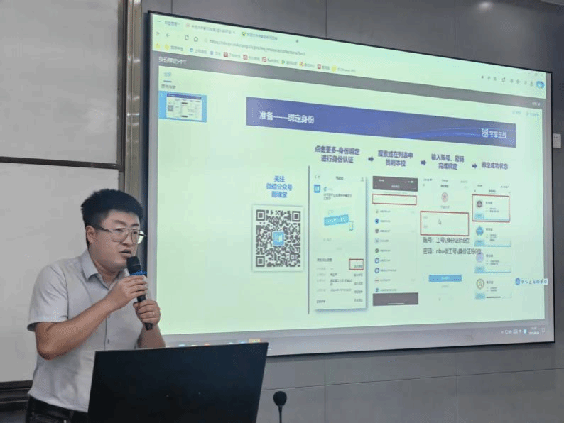 随后,雨课堂代表王宇对其软件的虚拟教研室、智能实验室分别进行详细介绍,并协助老师们现场完成身份绑定的前期准备工作。他表示,该软件通过整合线上教学资源、智能学习分析和互动交流模块,能够为师生提供个性化学习体验,助力智慧企业管理课程的高效开展。同时,他承诺将根据师生反馈持续优化软件功能,为教学活动提供坚实保障。