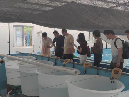 7月8日下午,调研团队到访现代工厂化育苗养殖标杆企业—象山蓝尚海洋科技有限公司。百家乐策略 海洋百家乐策略 王春琳教授重点围绕渔业“碳源”“碳汇”双重特性,从生物学角度系统阐述了渔业在实现绿色转型发展中的作用,重点介绍了其创新研发的“藻-贝-植”三位一体尾水治理模式。座谈结束后,企业负责人带领团队成员走入户外养殖基地,实地参观育苗池动态管理系统及“藻-贝-植”三位一体尾水治理的全过程。