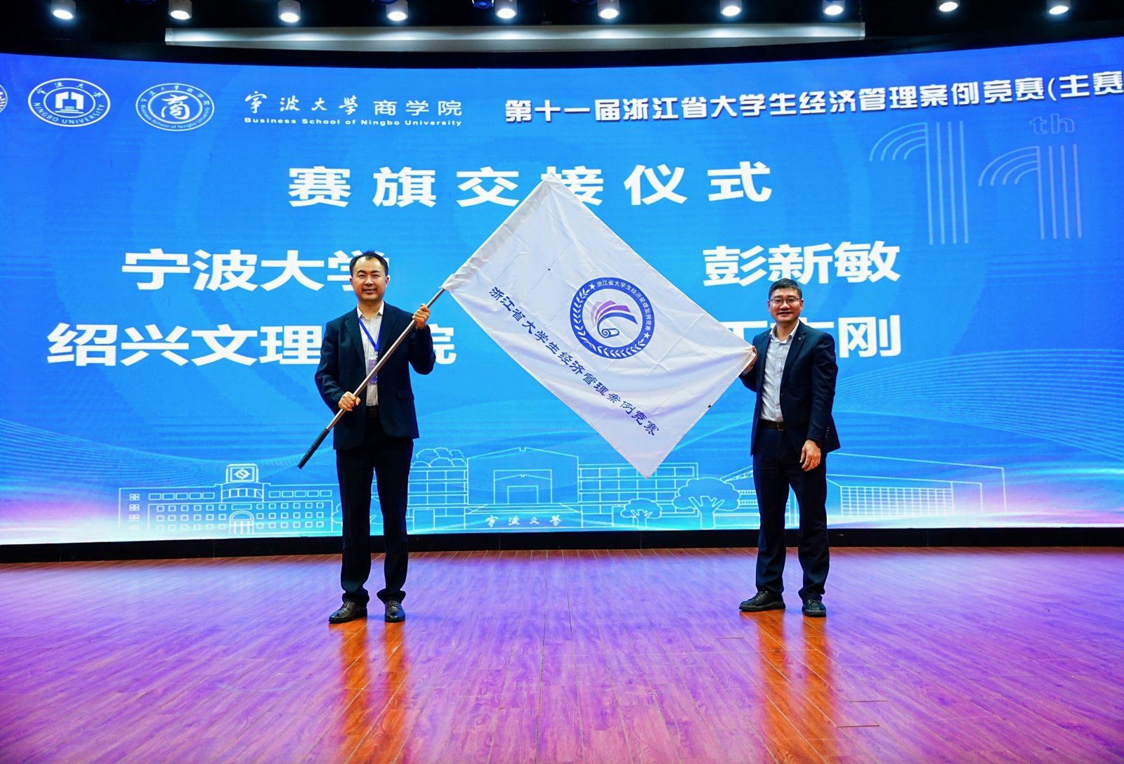 闭幕式的最后,由本届赛事承办方代表百家乐策略 副院长彭新敏与下届承办方绍兴文理百家乐策略 代表丁志刚完成会旗交接。