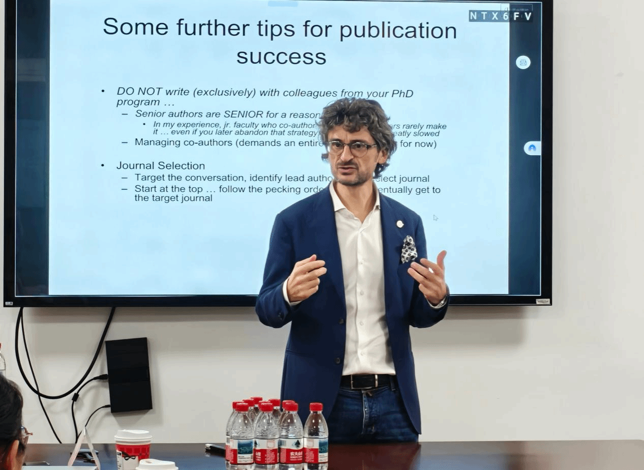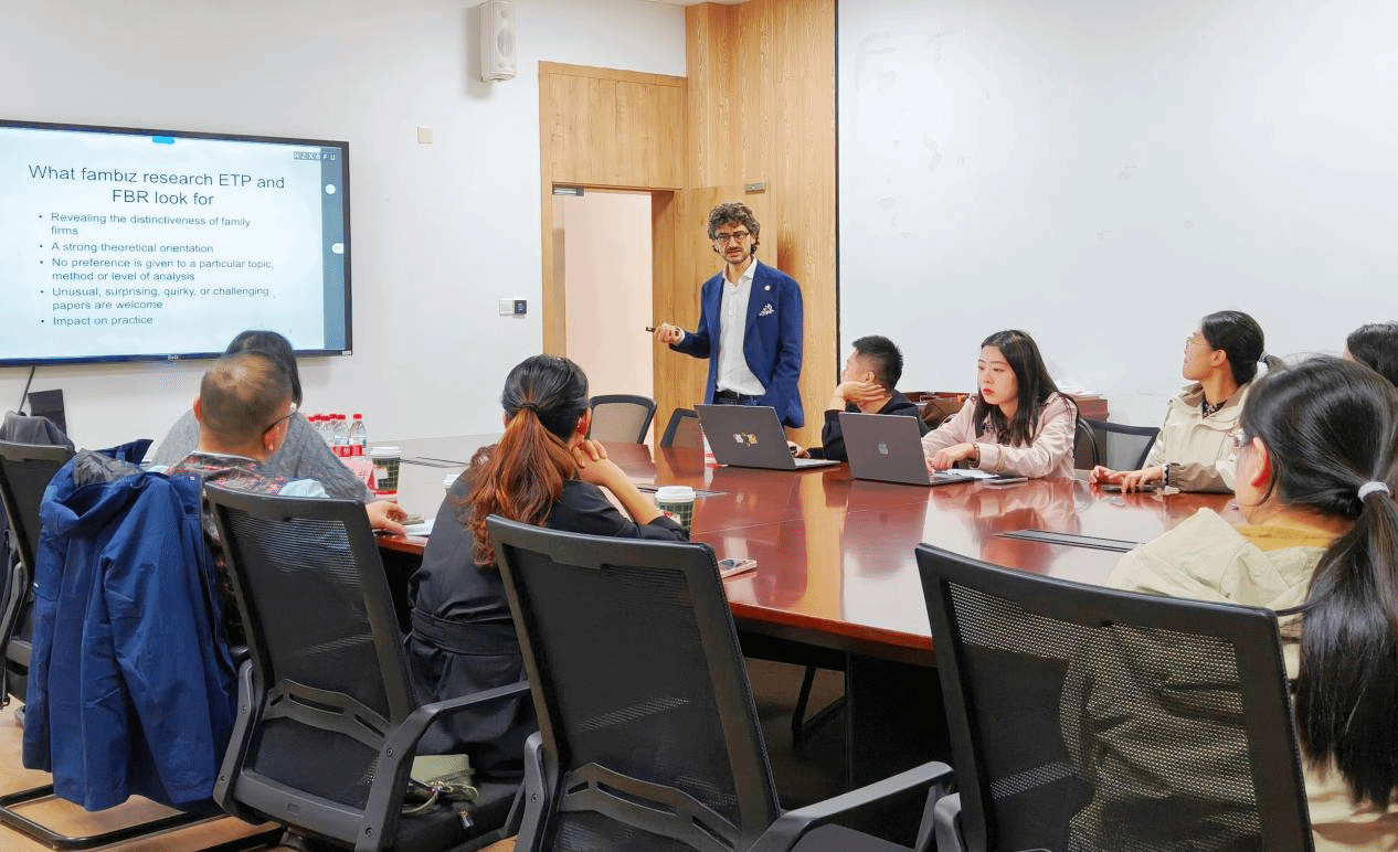讲座以Publishing family business research in ETP and FBR: What is needed for top journals为主题,Alfredo教授结合自身丰富的编辑经验,深入解析家族企业研究的顶级期刊发表之道。他强调,高质量论文需兼具理论独特性与实践相关性,既要揭示家族企业的鲜明特质、填补重要理论空白,也要能为实践提供有价值的指导。同时,教授详细分享了如何识别兼具学术贡献与现实意义的研究问题,以及构建严谨研究设计、打造有说服力理论框架的核心方法。