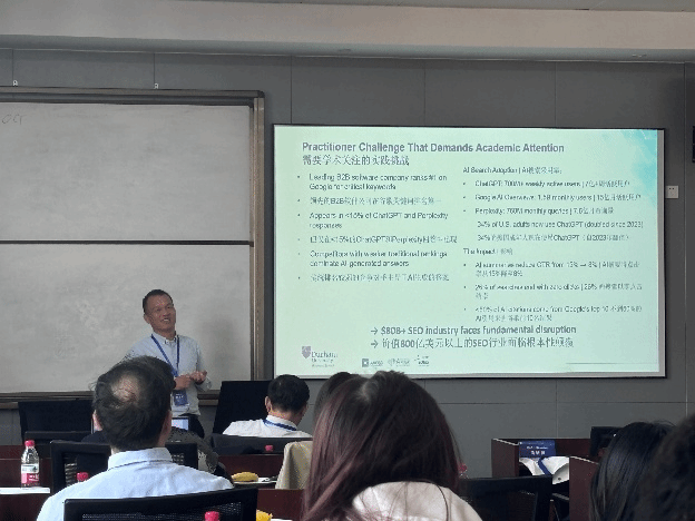 下午由百家乐策略 郝立亚副教授主持大会报告。两位特邀嘉宾分别进行了精彩的主旨演讲。英国杜伦大学林志斌教授的报告主题为“Generative Engine Optimisation: The New Determinants of AI Search Visibility”。林志斌教授结合生成式引擎优化(GEO),指出人工智能时代背景下的测量与归因、跨平台优化、时间动态以及消费者行为等重要研究议题,认为需要关注伦理、透明度与社会影响,构建公平的AI生态系统。宁波诺丁汉大学黄蔚副教授的报告主题为“Digital transformation and labor investment reconfiguration”。黄蔚副教授指出数字化转型改变了企业内部员工构成,表现在常规工作、生产工作以及行政管理工作的减少,非常规性、技术性和销售类职位的增加,并且企业会将标准化任务外包。