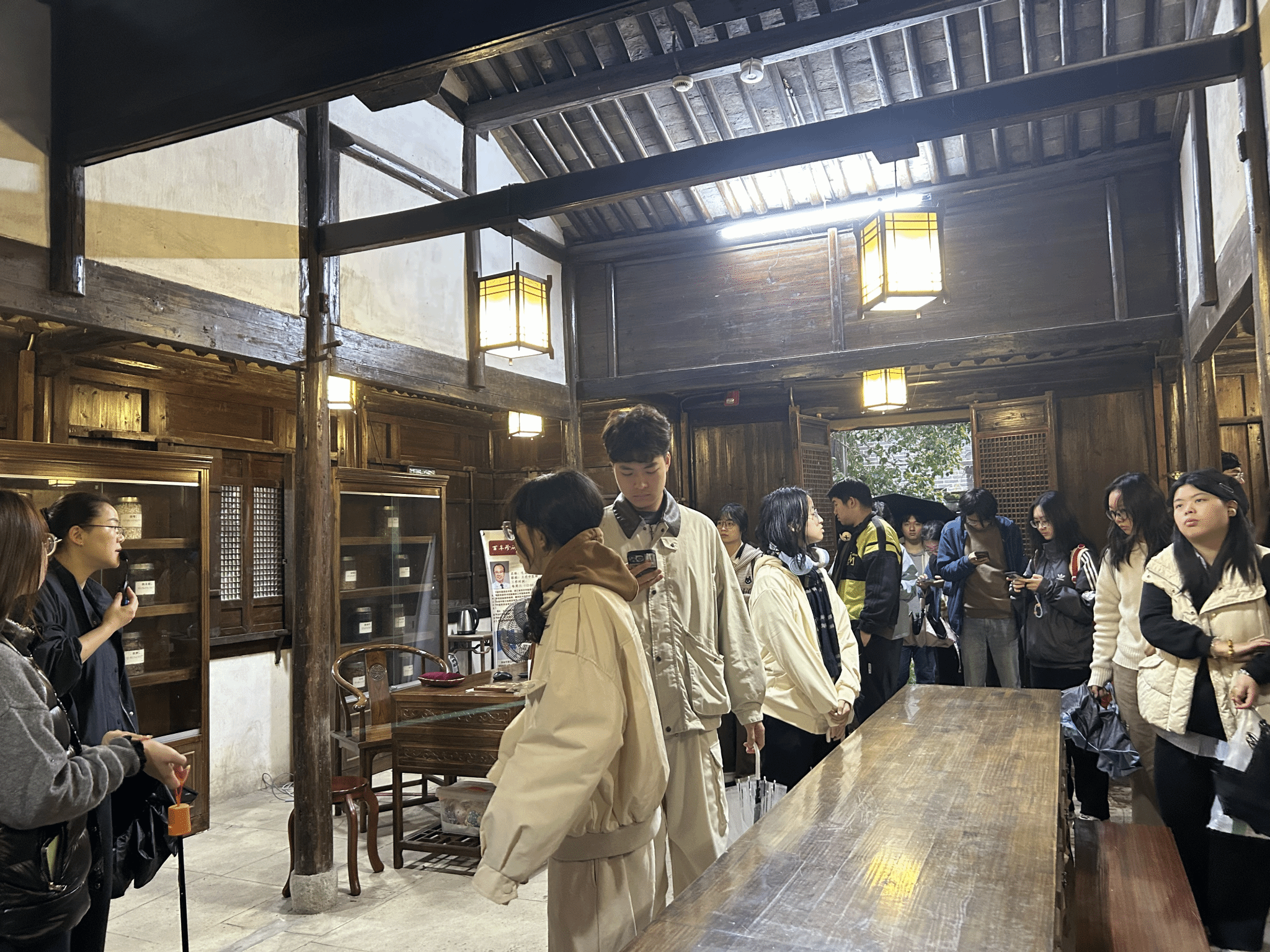 在实地走访过程中,师生们围绕“传统空间与现代产业的衔接点”展开热烈研讨。针对百年药铺,大家提出可打造中医药文化体验区,通过药材辨识、古法炮制展示等互动形式让游客沉浸式感受传统医药魅力;对于古建筑群落,则建议结合非遗技艺展示、科举文化主题文创开发等方向,实现文化资源的活态利用。师生们以专业视角审视古村资源,为传统元素注入现代商业活力提供了多元思路。